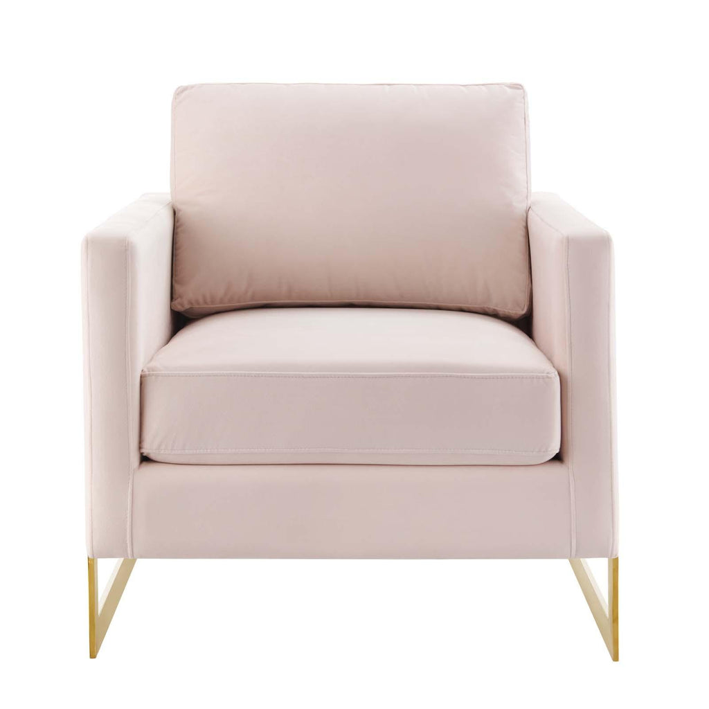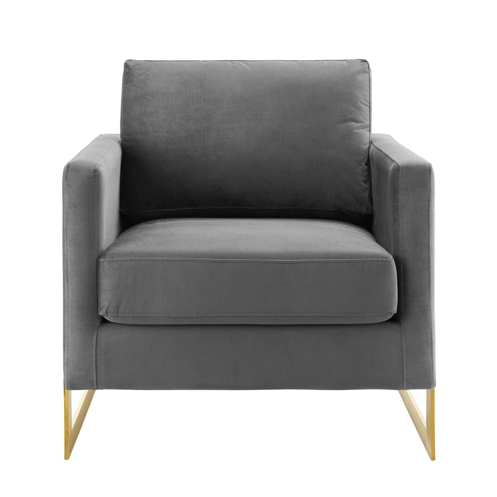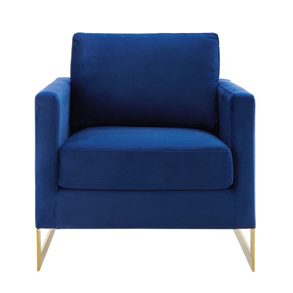 Welcome rich luxury and glam deco style to your living space with the Posse Performance Velvet Accent Chair. A striking addition to the living room, office, bedroom, or entryway, this armchair sits atop a gold chrome stainless steel sled base complete with squared edges and angular detail. Covered in soft, stain-resistant performance velvet, this upholstered armchair features dense foam padding over no-sag springs for a premium seating experience abounding in comfort and support. This velvet chair is perfect for offices looking to impress new clients and for anyone intrigued by retro modern designs that develop space and form in an innovative way. Includes non-marking foot pins. Assembly Not Required. Weight Capacity: 300 lbs. Set Includes: One - Posse Accent Chair Modern Accent Chair Performance Velvet Upholstery Durable Stain-Resistant Fabric Dense Foam Padding + Spring Support Gold Chrome Stainless Steel Frame Non-Marking Foot Pins Weight Capacity: 300 lbs. Overall Product Dimensions: 33"L x 34"W x 34"H Seat Dimensions: 20"L x 23.5"W x 18.5"H Armrest Dimensions: 33"L x 30"W x 25.5"H Backrest Dimensions: 30"W x 25.5"H Cushion Thichkness: 6.5"H