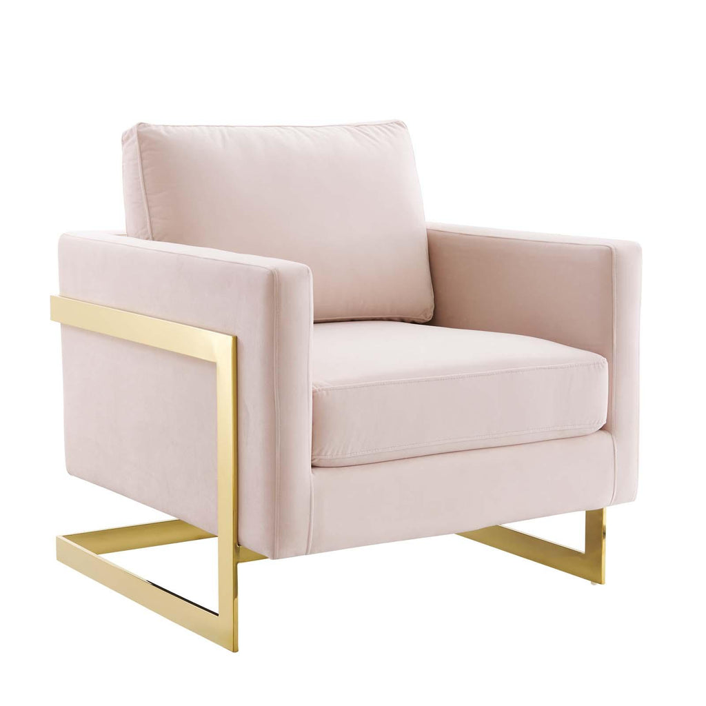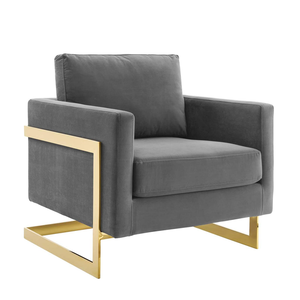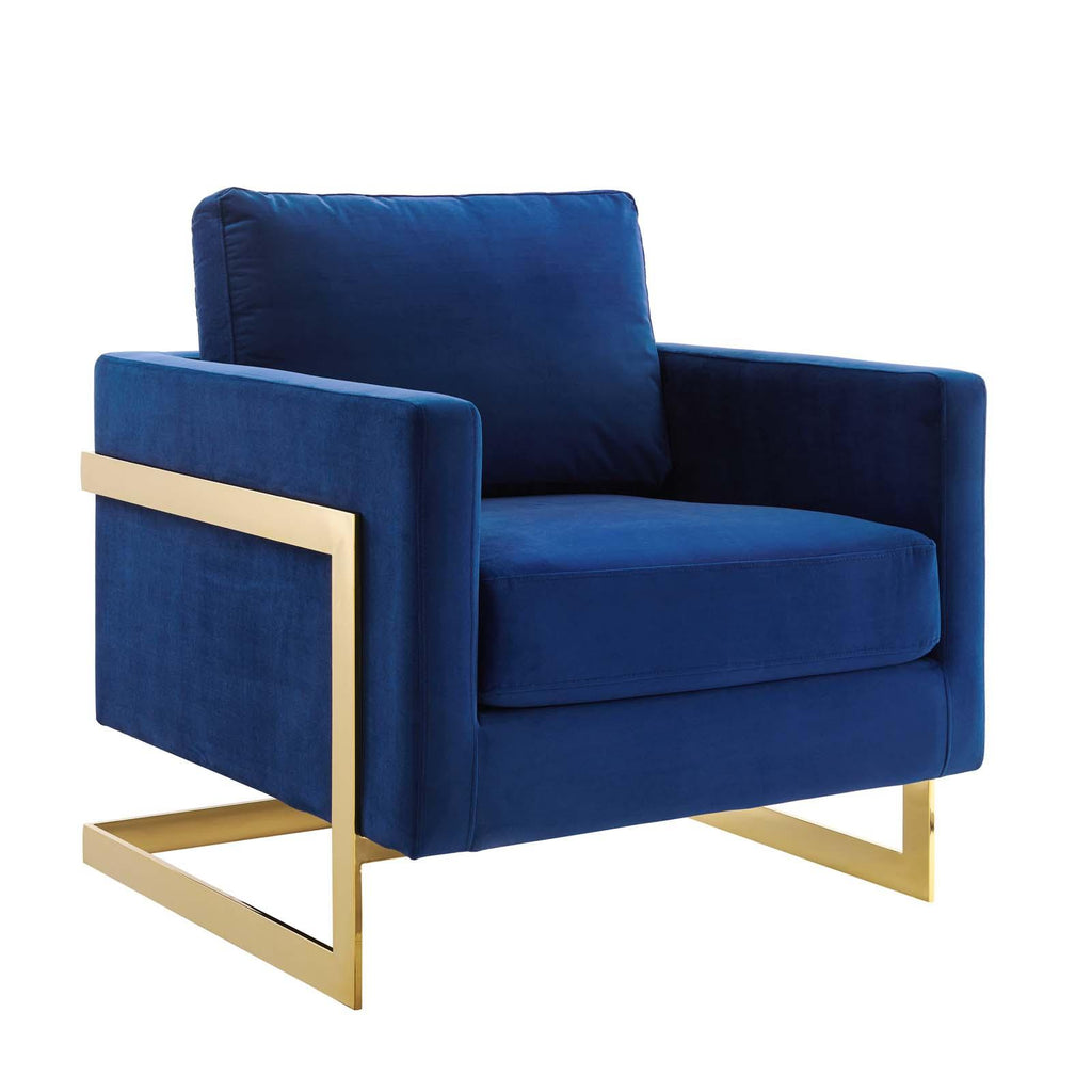 Welcome rich luxury and glam deco style to your living space with the Posse Performance Velvet Accent Chair. A striking addition to the living room, office, bedroom, or entryway, this armchair sits atop a gold chrome stainless steel sled base complete with squared edges and angular detail. Covered in soft, stain-resistant performance velvet, this upholstered armchair features dense foam padding over no-sag springs for a premium seating experience abounding in comfort and support. This velvet chair is perfect for offices looking to impress new clients and for anyone intrigued by retro modern designs that develop space and form in an innovative way. Includes non-marking foot pins. Assembly Not Required. Weight Capacity: 300 lbs. Set Includes: One - Posse Accent Chair Modern Accent Chair Performance Velvet Upholstery Durable Stain-Resistant Fabric Dense Foam Padding + Spring Support Gold Chrome Stainless Steel Frame Non-Marking Foot Pins Weight Capacity: 300 lbs. Overall Product Dimensions: 33"L x 34"W x 34"H Seat Dimensions: 20"L x 23.5"W x 18.5"H Armrest Dimensions: 33"L x 30"W x 25.5"H Backrest Dimensions: 30"W x 25.5"H Cushion Thichkness: 6.5"H
