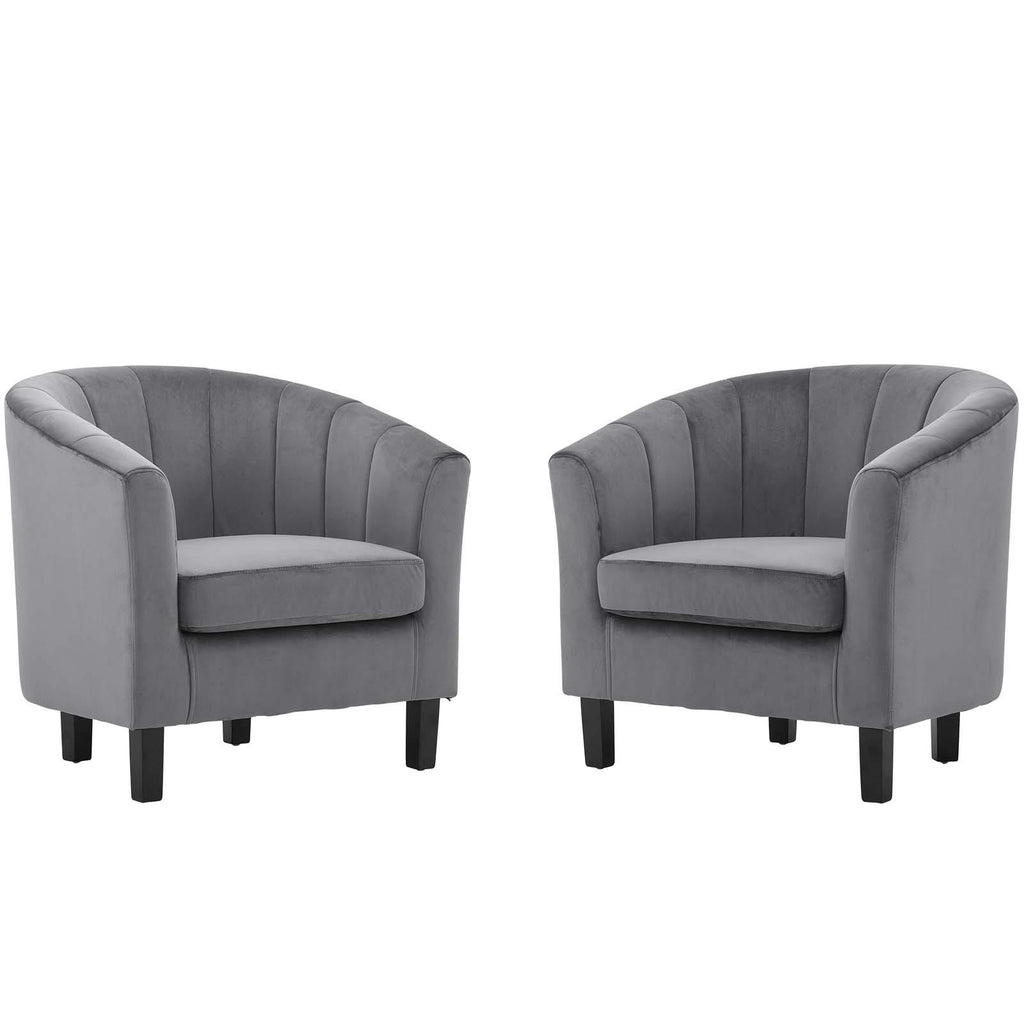 A fresh outlook on a familiar classic, Prospect Performance Velvet Armchair Set of 2 brings intrinsic luxury to your living space. This barrel back armchair set comes upholstered in stain-resistant performance velvet fabric, and boasts chic channel tufting, updating the Chesterfield-inspired profile with retro modern design elements. The densely padded removable seat and backrest grant approachable comfort that beckons guests to sit and stay a while.