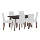 Offer your dining decor an effortlessly elegant update with the 7 Piece Prosper Dining Room Set which features one 59" Rectangle Dining Table and six Modern Faux Leather Upholstered Parsons Dining Chairs. Defined by chic simplicity, this modern set completes your dining experience with its sturdy construction and comfortable seating experience. Dining Table is constructed with MDF top with four tapered wood legs and Dining Chairs have a rubberwood frame, cushioned with dense foam padding, and covered with smooth faux leather upholstery. Prosper is a modern Parsons chair set that enhances any contemporary home or apartment. Assembly Required. Chair Weight Capacity: 331 lbs.