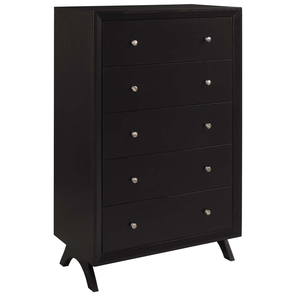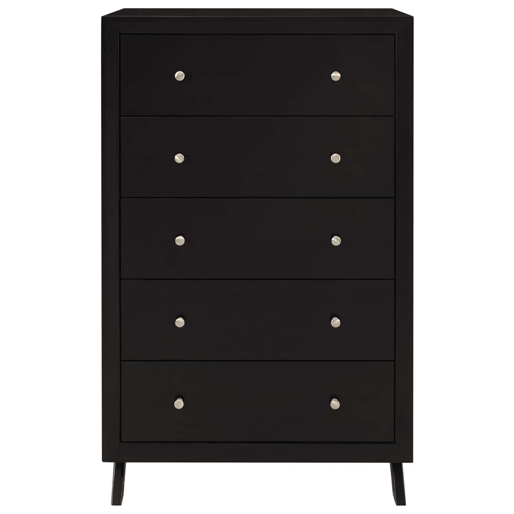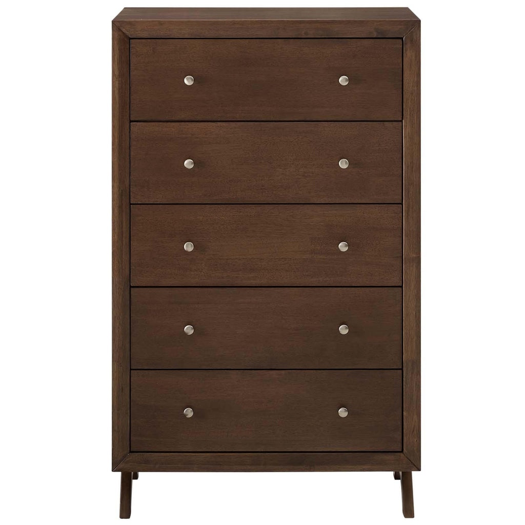 Introduce retro style and contemporary flair to a guest suite, master bedroom, or living room with the Providence Chest or Stand. Crafted with solid rubberwood and durable MDF, Providence boasts linear detail, elegantly tapered legs with non-marking foot caps, polished silver metal knobs, and a rich wood grain veneer that embodies classic mid-century design. The five full-extension glide drawers grant spacious, concealed storage. Display and store your pictures, home accessories, clothes, and more with this contemporary modern chest or stand.