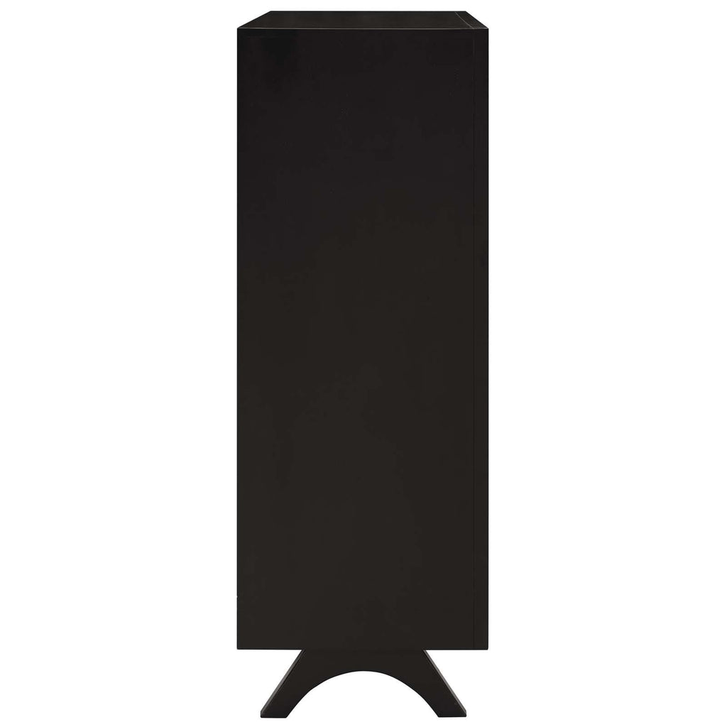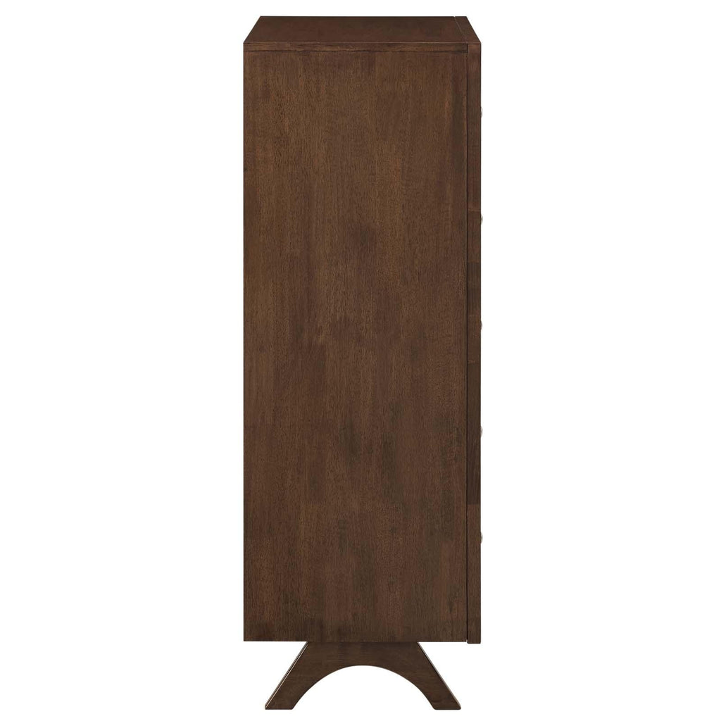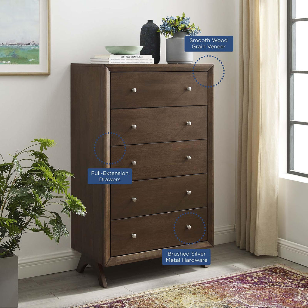 Introduce retro style and contemporary flair to a guest suite, master bedroom, or living room with the Providence Chest or Stand. Crafted with solid rubberwood and durable MDF, Providence boasts linear detail, elegantly tapered legs with non-marking foot caps, polished silver metal knobs, and a rich wood grain veneer that embodies classic mid-century design. The five full-extension glide drawers grant spacious, concealed storage. Display and store your pictures, home accessories, clothes, and more with this contemporary modern chest or stand.