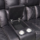 This new and beautiful reclining loveseat is finished in a soft black. There is detailed contrast stitching throughout. The cushions and seating are plush but offer great support. The center console offers storage and 2 stainless steel cup holders.