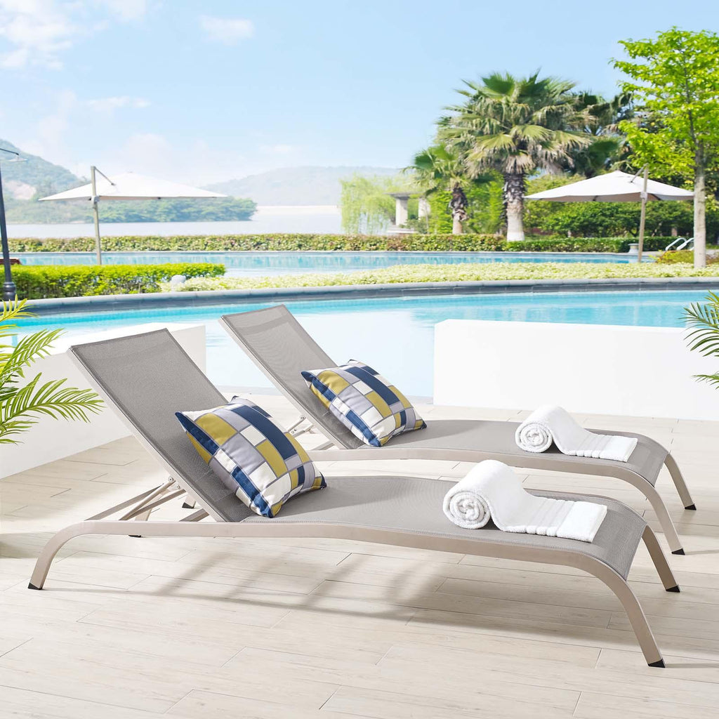 Energize your patio decor with the versatile vintage glamour Savannah Outdoor Patio Mesh Chaise Lounge Chair Set of 2. A sleek design that evokes a retro-modern feel, Savannah features all-weather Textilene mesh fabric that creates a breathable fabric for a pleasant outdoor lounging experience. Complete with an anodized matte aluminum frame with non-marking foot caps, Savannah is a deceptively simple piece creates an aura of vintage glamour in your patio decor. This set of elegant outdoor sun loungers is a perfect addition to the backyard, poolside, porch, deck, or balcony. Chair Weight Capacity: 661 lbs. Set Includes: Two - Savannah Outdoor Patio Mesh Chaise Lounge Chair Vintage Glamour Style Patio Chaise Lounge Chairs Textilene Mesh Fabric Anodized Aluminum Frame Non Marking Foot Caps Outdoor Chair Chair Weight Capacity: 661 lbs No Assembly Required Overall Product Dimensions: 76.5"L x 50"W x 12"H Individual Chaise Dimensions: 76.5"L x 25"W x 12"H
