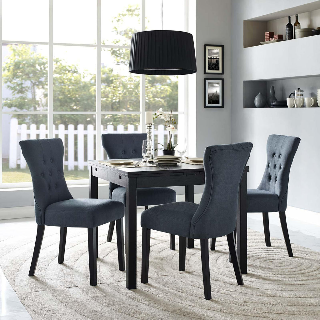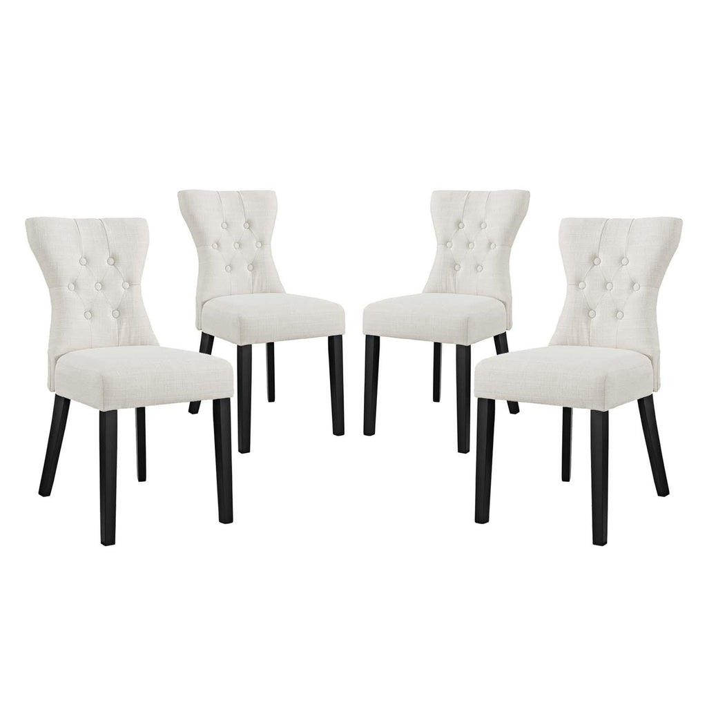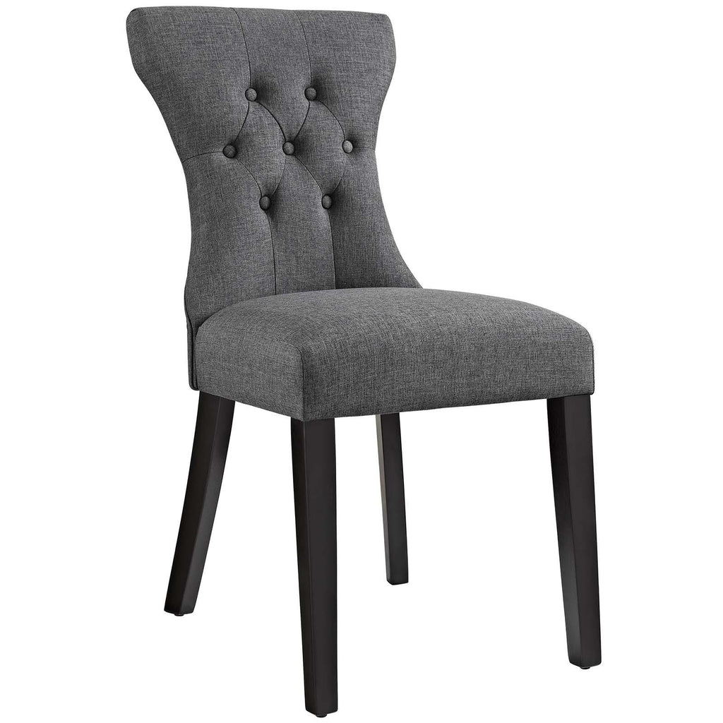 Graceful curves whisper elegance from every position with the Silhouette Button Tufted Tapered Back Fabric Upholstered Dining Side Chair set. Dense foam padding and soft fabric upholstery cover this elegantly comfortable dining accent chair. A softly tapered back and hourglass shape lend an eye-catching visual flow while a solidly constructed wood frame and rounded hardwood legs with non marking foot caps create a durable dining accent chair. Invite your way into the lap of luxury at every gathering.