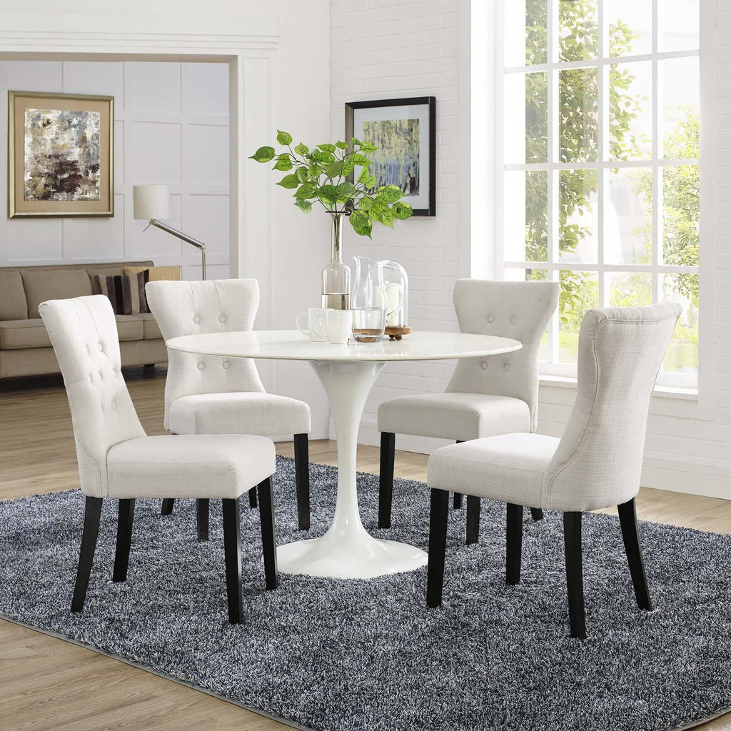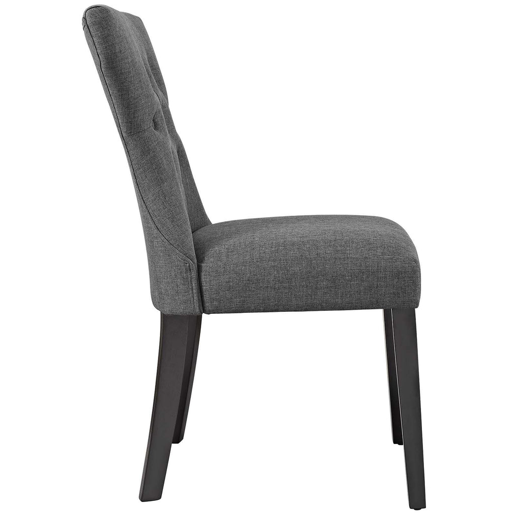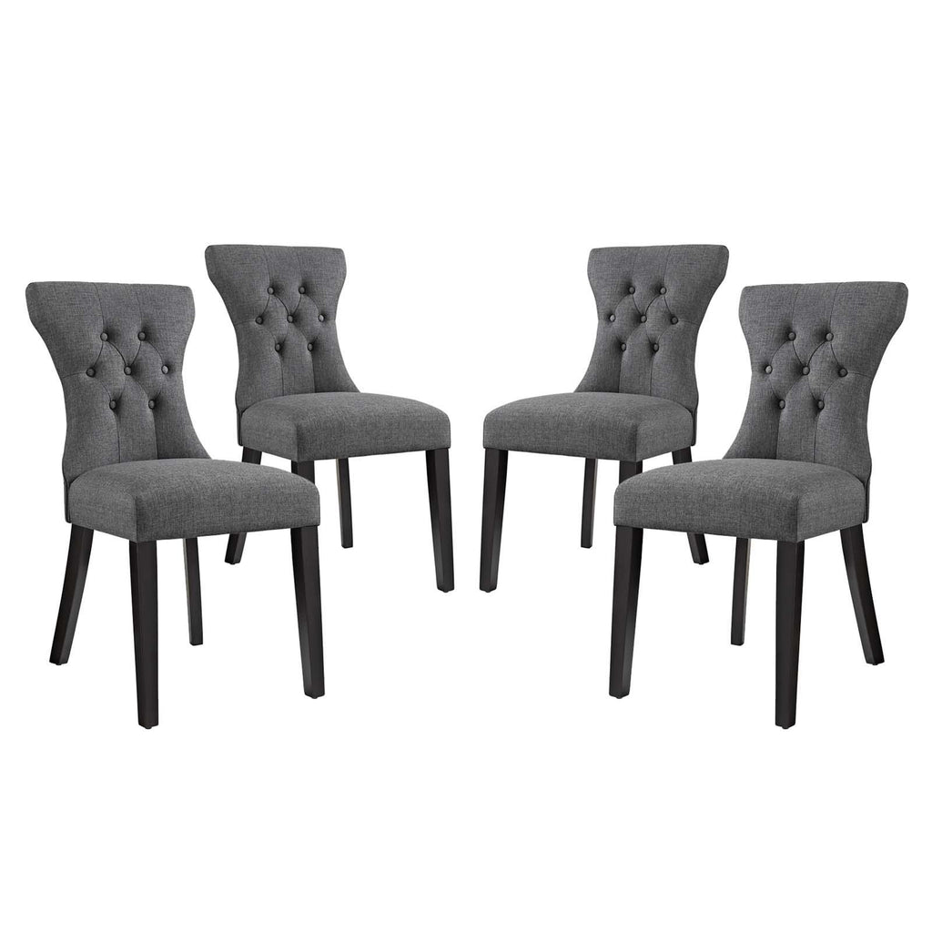 Graceful curves whisper elegance from every position with the Silhouette Button Tufted Tapered Back Fabric Upholstered Dining Side Chair set. Dense foam padding and soft fabric upholstery cover this elegantly comfortable dining accent chair. A softly tapered back and hourglass shape lend an eye-catching visual flow while a solidly constructed wood frame and rounded hardwood legs with non marking foot caps create a durable dining accent chair. Invite your way into the lap of luxury at every gathering.
