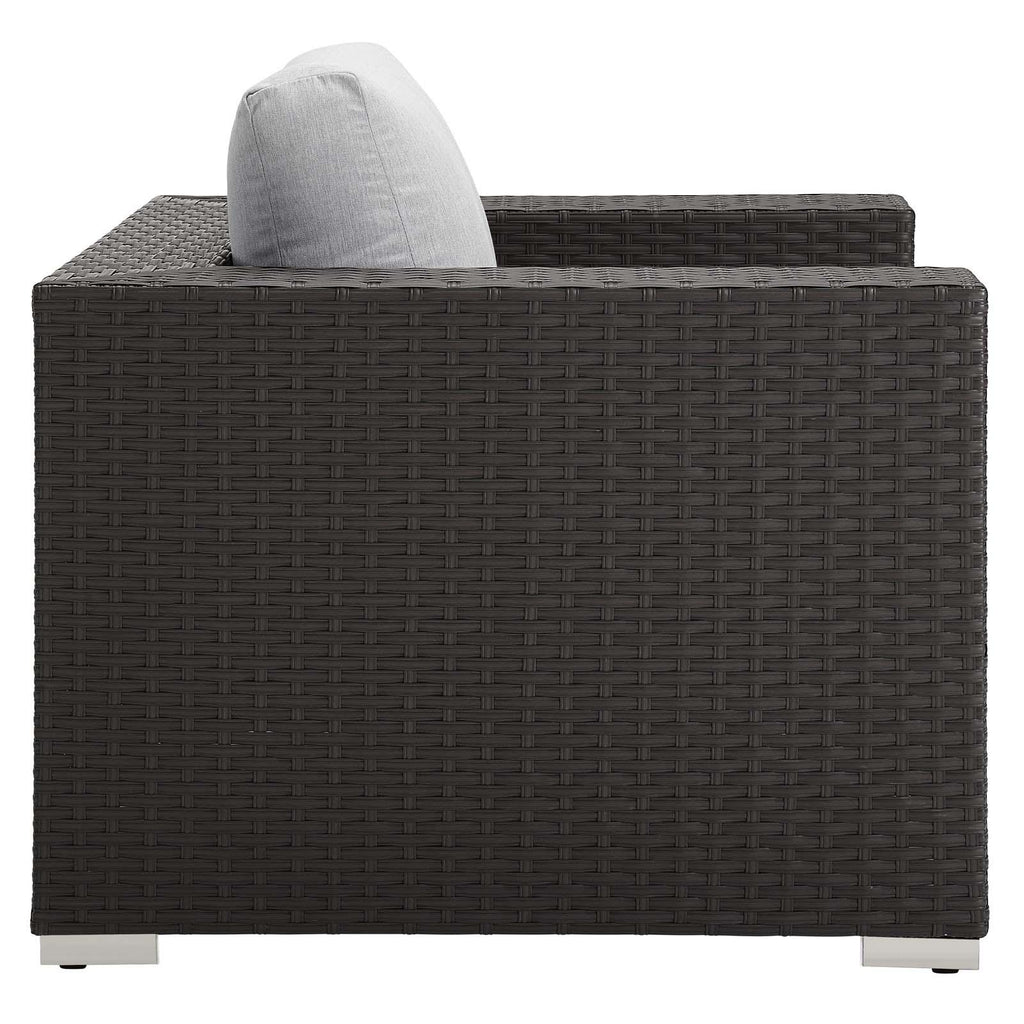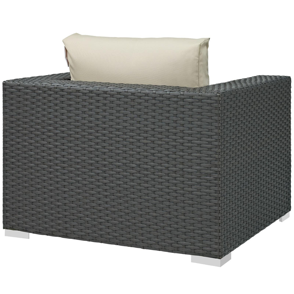 Outfit your patio with an imaginative Sojourn Outdoor Patio Furniture series. The Sojourn Outdoor Patio Arm Chair offers a robust seating experience that easily rearranges according to usage. Outfitted with industry-leading Sunbrella� fabric cushions, synthetic rattan weave, UV protection, powder-coated aluminum frame, immensely enjoy your outdoor time with an outdoor deck chair that enhances patio, backyard, or poolside areas. This installment of the series is an Outdoor Patio Arm Chair.