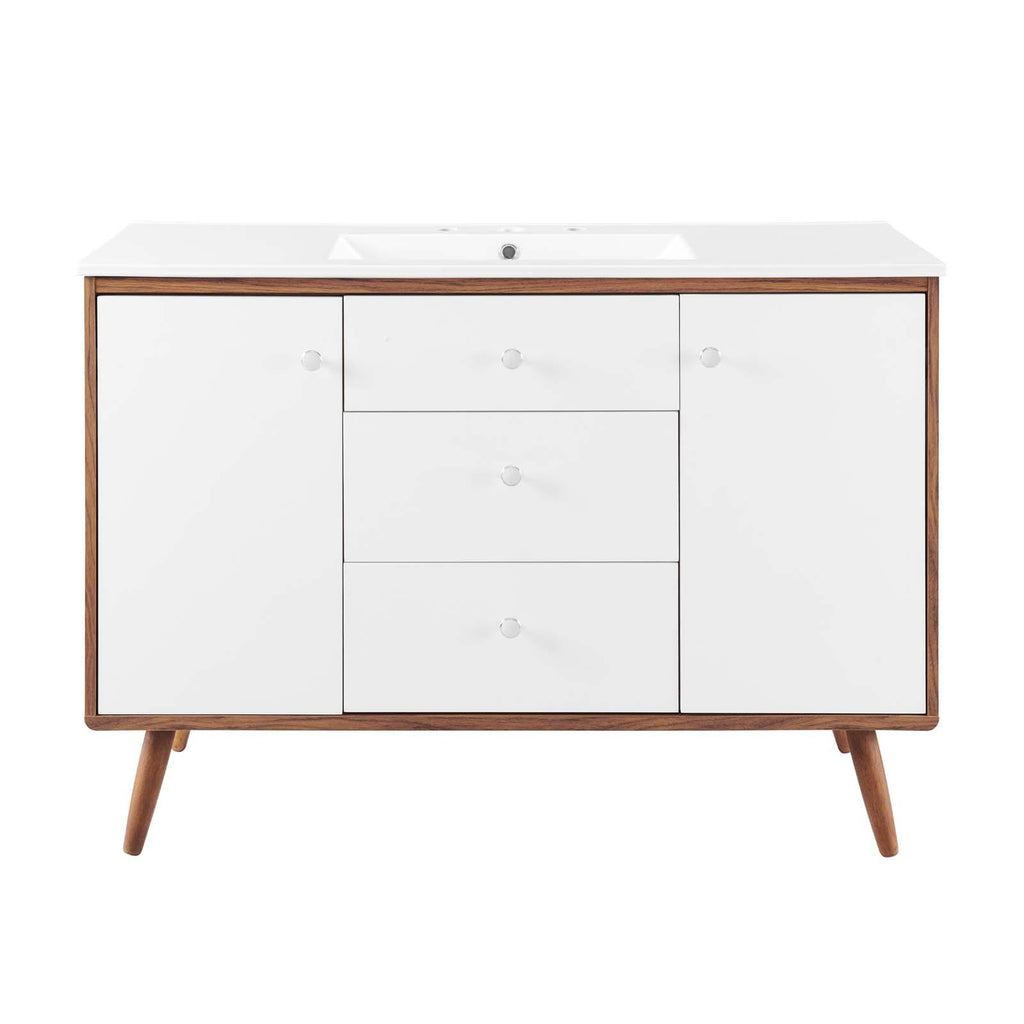 Bring mid-century modern aesthetics into the bathroom with the Transmit 48" Bathroom Vanity. This vanity features a durable particleboard and walnut grain veneer construction with ample storage space for all your bathroom essentials behind two white lacquered soft-close hinged doors and two full-extension drawers with a fixed center drawer. A ceramic sink with an integrated countertop, 8" centerset, and rectangular sink basin continue the sleek look of this retro modern vanity. Complete with chrome knobs, this bathroom vanity rests atop four splayed wood legs. Assembly required and sink fixtures not included. Set Includes: One - Transmit 48" Single Sink Bathroom Vanity Mid-Century Modern Vanity Splayed Wood Legs Ceramic Sink Basin Particleboard and Walnut Grain Veneer Dual Soft-Close Doors Full-Extension Drawers Assembly Required Overall Product Dimensions: 47"L x 18"W x 33"H