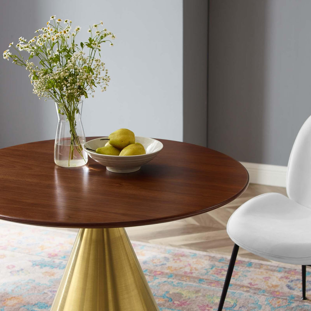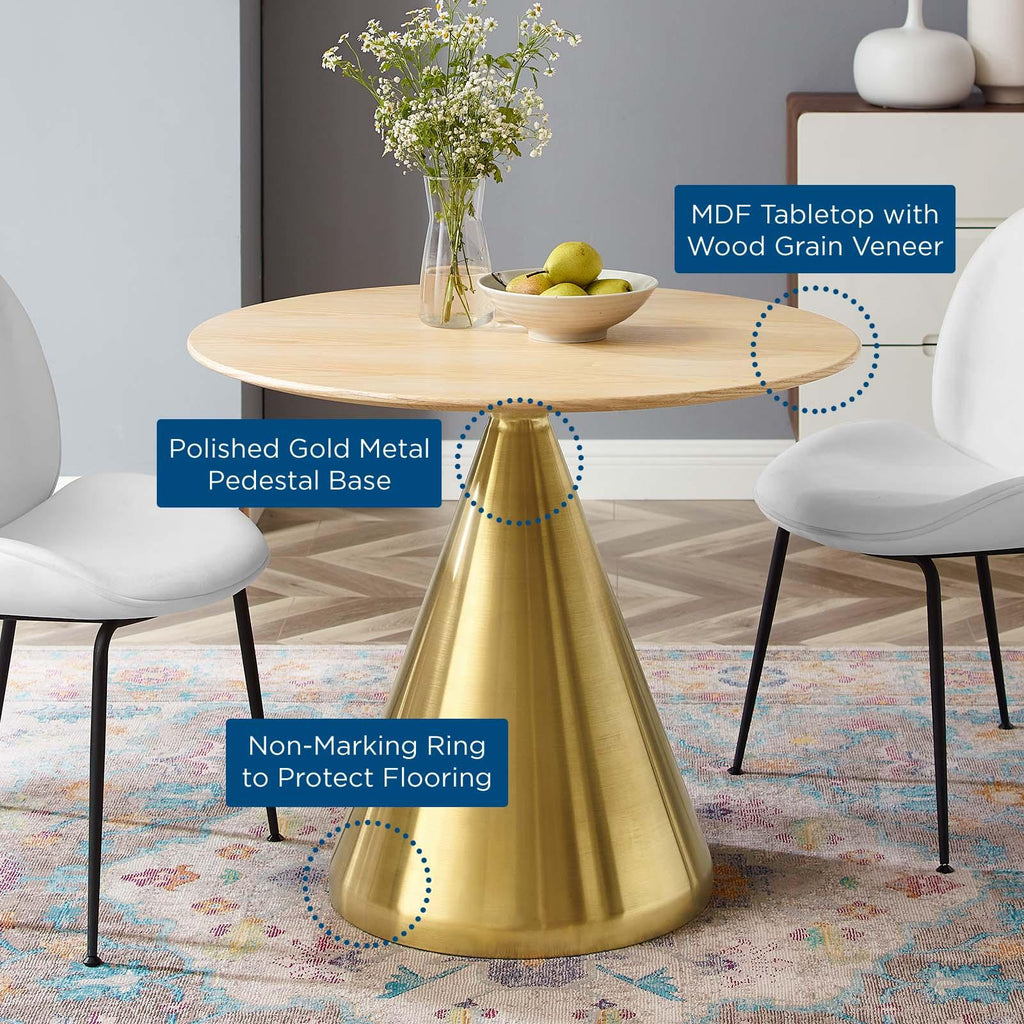 Connect with family and friends over good food and conversation with the Tupelo 36" Dining Table. Inspired by modern style and mid-century influence, this pedestal table reflects an organic shape and is perfect for entertaining or everyday dining. This dining table rests on a conical polished gold metal pedestal base and features a 36" tabletop crafted with MDF with an easy-to-clean white coating. Non-marking ring to protect flooring. Assembly required. Set Includes: One - Tupelo 36" Dining Table Modern Dining Table MDF Tabletop White Coating Polished Gold Metal Pedestal Base Non-Marking Ring Assembly Required Overall Product Dimensions: 35.5"L x 35.5"W x 28.5"H Floor to underside of table: 27.5"H Table Top Thickness: 1"H Width of Base: 20"W