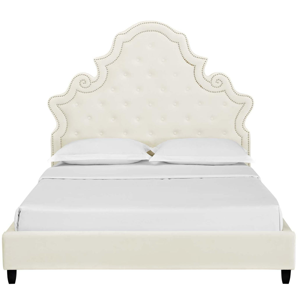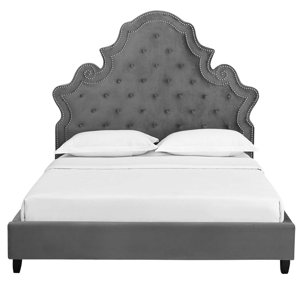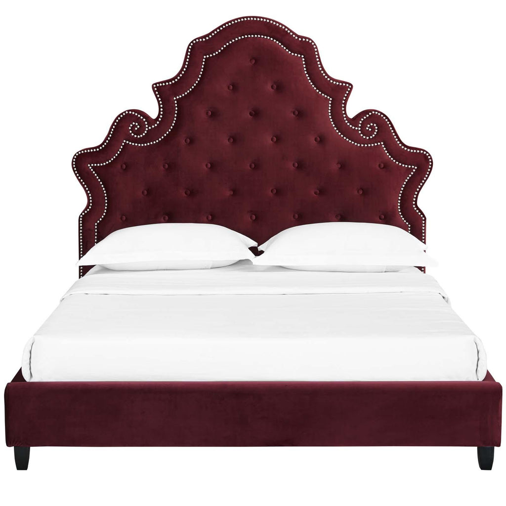 Make rich opulence the focal point of your master bedroom or guest suite with the Valentina Performance Velvet Tufted Nailhead Queen Platform Bed. A modern update on Victorian-era style, this upholstered queen bed frame featuring a padded queen headboard with ornate curves, diamond button tufting, and classic nailhead trim. Valentina comes upholstered in luxurious performance velvet, made with stain-resistant polyester fabric, and dense foam padding offering supportive comfort. Eliminating the need for a box spring, Valentina comes complete with a wood slat support system and reinforced center beam. Perfect for sitting up and relaxing in bed, introduce a lasting mattress foundation for latex, memory foam, innerspring, and hybrid mattresses with the Valentina Queen Platform Bed. Maximum Weight Capacity: 1322 lbs.