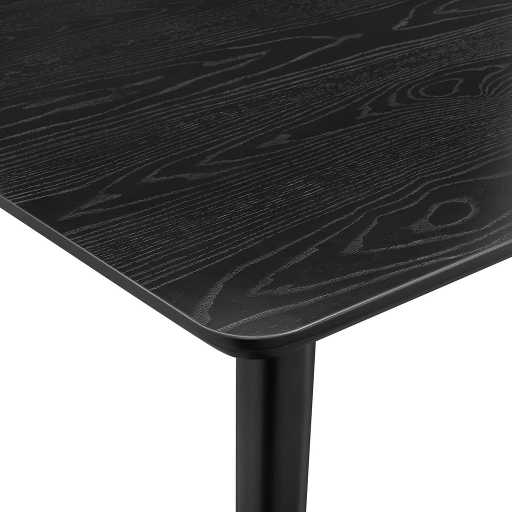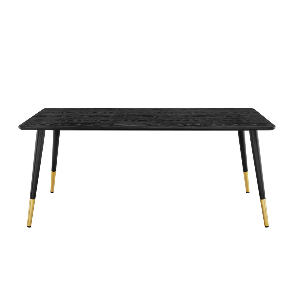 Bring modern influence to your dining room or kitchen space with the deliberate style of the Vigor Rectangular Dining Table. Reflecting a seamless organic shape, this dining table sits atop four splayed iron legs with gold metal sleeves that bring a glamorous flair to the mid-century modern silhouette. This kitchen table features a MDF tabletop embossed with matte black lacquer creating the perfect place to gather for mealtime and dinner parties. Includes adjustable foot caps. Assembly required.