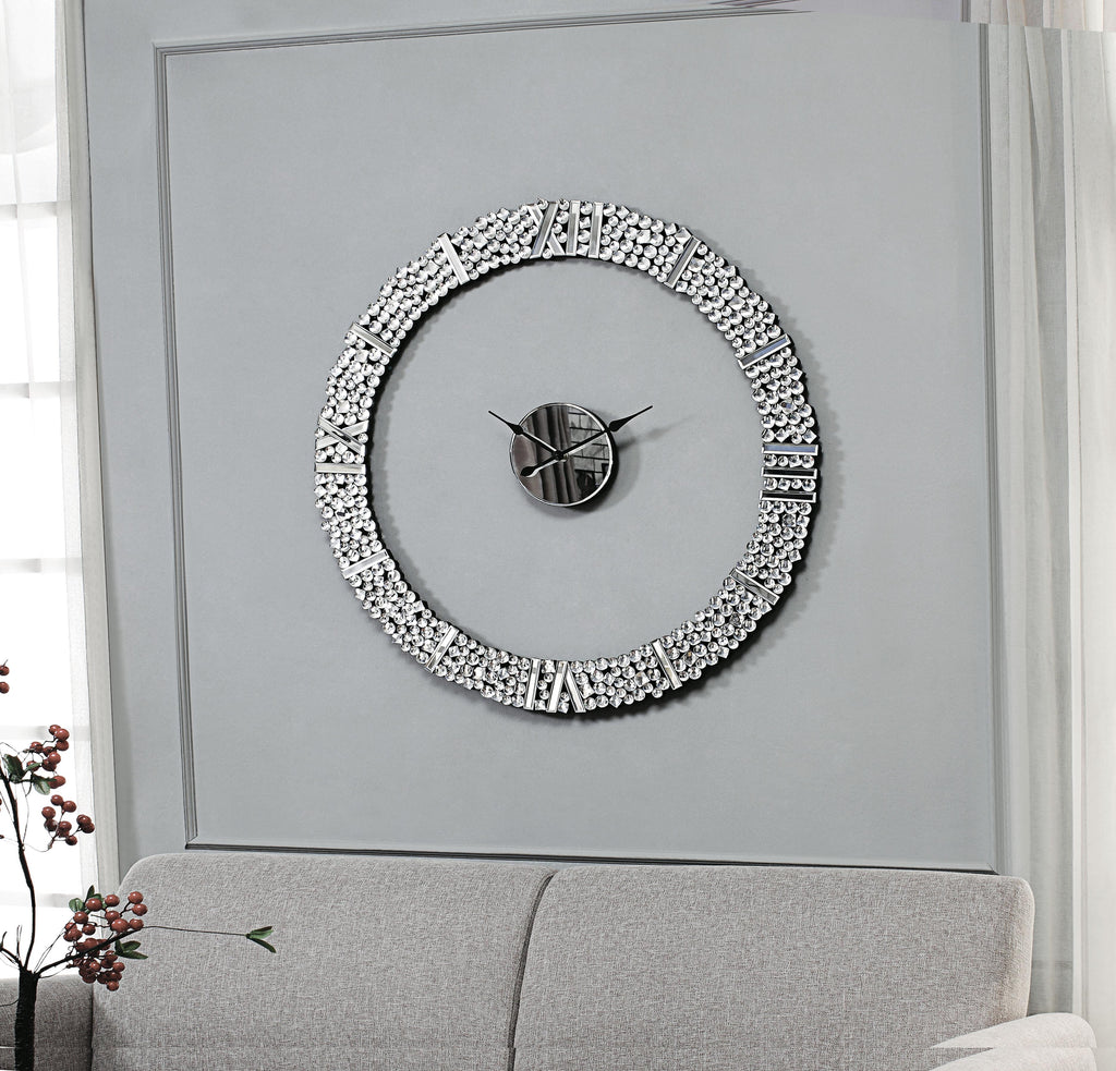 ACME Kachina Wall Clock, Mirrored & Faux Gems, 39"Dia, 20lbs. The march of time is predictable, but that doesn't mean the appearance of your clock has to be! This design is sure to work as a focal point in any ensemble with features like a striking round silhouette, and mirrored panels with faux gems. The Kachina wall clock boasts a wow-worthy look. Features: - Wall Clock - Mirrored Beveled Trim - Clock Dial: Roman Numerals - Quartz Mechanism - Battery NOT Included (1Pc of AA 1.5V) - Wall Hardware NOT Included - (NO Sound/Chime) Materials: Clock, Mirror, Faux Crystals, Composite Wood