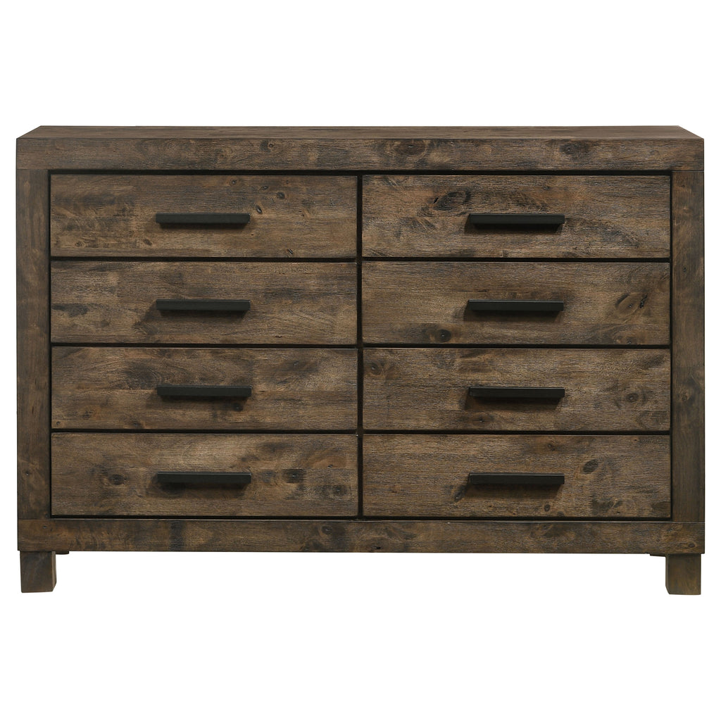 Complete your bedroom with the rugged elegance of this eight-drawer dresser. Crafted with solid hardwood, it features a full matte rustic golden brown finish with wire-brushed details that highlight the natural wood grain. Eight roomy drawers provide ample storage space for clothing, linens, or accessories, each fitted with durable wooden pull handles for a cohesive design. Resting on sturdy block-style legs, this dresser combines rustic charm with everyday practicality, making it a timeless addition to a transitional bedroom setting._x005F_x000D_ Key Features: • Rustic golden brown dresser crafted with solid hardwood for durability • Matte finish with wire-brushed details highlights natural wood grain • Eight spacious drawers offer ample storage for clothing and accessories • Wooden pull handles provide sturdy function and rustic handcrafted charm • Block-style legs deliver strong support and a rugged visual foundation • Perfect for pairing with matching nightstand, chest, and storage bed