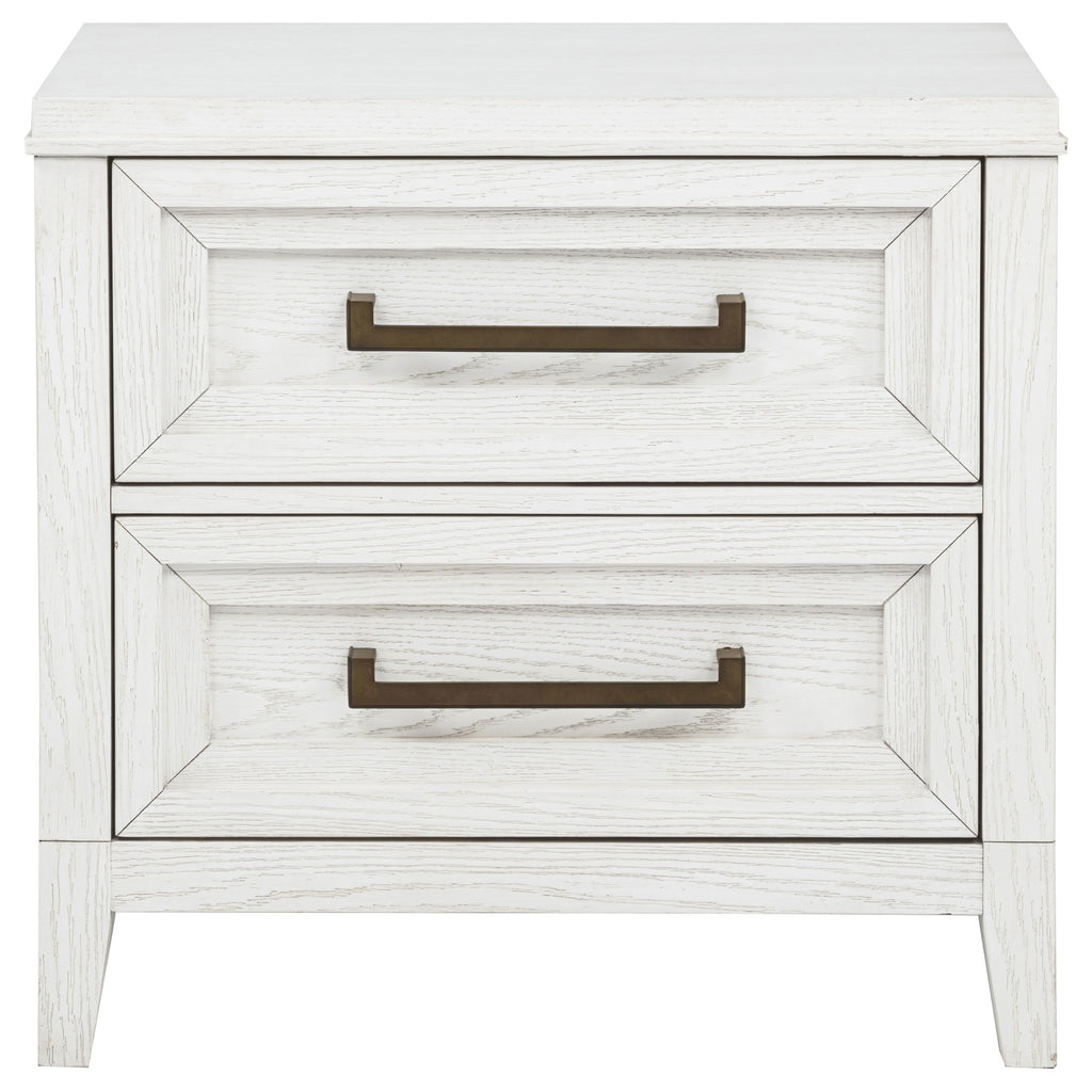 Bring fresh perspective to your bedside with a modern two-drawer nightstand. Its casual style and classic stance create a restrained look and feel, perfect for a soothing bedroom space. It features a distressed white finish over wood grain, creating subtle depth and detail. Drawers are roomy for bedside essentials, and stepped fronts add character and dimensionality. Contrasting antique brass toned bar pull complete the look, offering stylish allure in your stylish bedroom. Key Features: • Add easy bedside storage with two roomy drawers in a modern nightstand • Distressed white finish allows light wood grain detail to show through, adding character • Stepped drawer front design creates depth and dimensional character • Long bar pulls add contrast with a antique brass toned finish and angular design • Includes a tip-over restraint for added safety and peace of mind