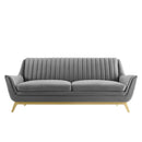 Bring rich tactiles and vintage modern charm to your living space with the Winsome Channel Tufted Performance Velvet Sofa. Putting a glam deco twist on a classic mid-century modern design, this living room sofa features vertical channel tufting on the backrest, gold metal detail, and a flared silhouette. Covered in stain-resistant performance velvet, this upholstered sofa is padded with dense foam and complete with a no-sag pocket coil spring support system. With a solid wood and plywood frame, this velvet sofa rests on gold stainless steel legs with plastic foot glides and supports up to 900 lbs. Set Includes: One - Winsome Channel Tufted Sofa Channel Tufted Sofa Stain-Resistant Performance Velvet Dense Foam Padding Pocket Spring Support Solid Wood and Plywood Frame Gold Stainless Steel Legs Weight Capacity: 900 lbs. Backrest Height: 15.5"H Overall Product Dimensions: 32"L x 82"W x 33.5"H Seat Dimensions: 22.5"L x 64.5 - 67.5"W x 17.5"H Armrest Height: 23"H