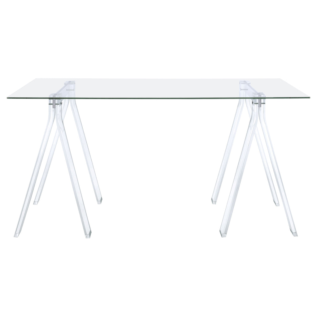Enjoy an airy workspace with this 59-inch writing desk, pairing a sleek acrylic sawhorse base and a clear tempered glass top. Heavy gauge steel supports, finished in electroplated chrome, connect the legs for added stability and a polished accent. The translucent design keeps your office bright and open, suiting both modern and minimalist décor. Perfect for writing, studying, or creative tasks, this piece merges function and cutting-edge style seamlessly. Key Features: • 59-inch writing desk for a spacious work surface • Clear tempered glass top exudes a chic, minimalist feel • Acrylic sawhorse base brings sleek, modern appeal • Heavy gauge steel supports in electroplated chrome for extra stability • Transparent design keeps your workspace bright and uncluttered • Ideal for home offices, studios, or contemporary setups