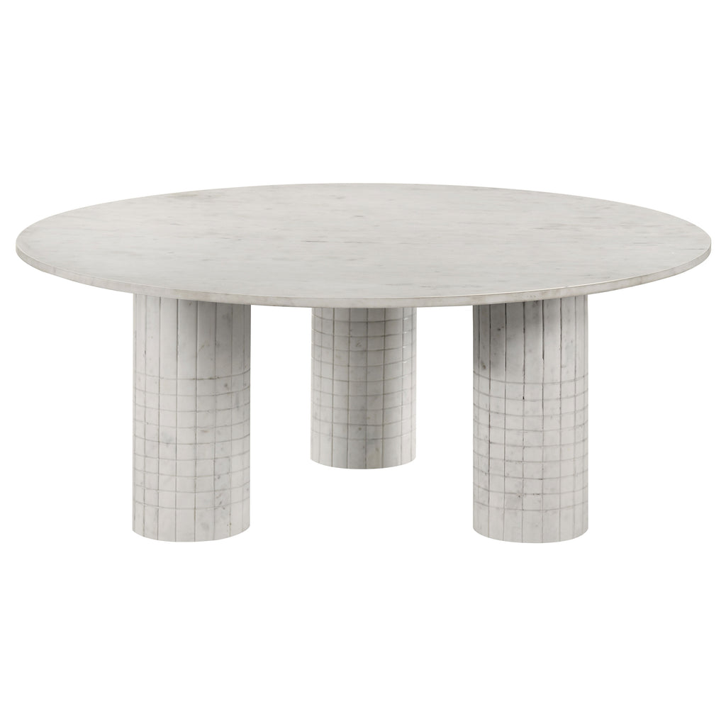 This coffee table set, featuring a coffee table and end table, showcases genuine white marble surfaces and cylindrical pedestal bases. The fluted and grid-textured design adds a refined architectural touch, blending classic elegance with modern minimalism. Perfect for creating a cohesive look in your living space, these tables are crafted for durability and timeless appeal. Ideal as functional and decorative pieces, this occasional table set brings sophistication to any contemporary or upscale interior. Key Features: • Coffee table set crafted with genuine white marble tops • Round surfaces provide smooth and spacious functionality • Cylindrical pedestal bases with subtle grid-textured details • Durable marble construction ensures long-lasting quality • Refined architectural design complements modern interiors • Perfect occasional table set for contemporary living spaces