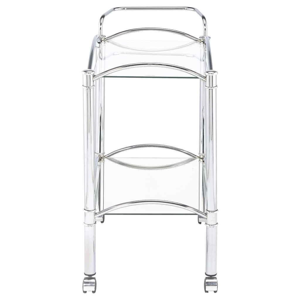 Simple elegance with a modern twist. This freshly styled serving cart offers a tasteful addition to contemporary decor. With a sleek chrome finish, its metal frame receives romantic curved accents. A tempered glass top shelf and mirrored bottom shelf accommodate beverages, food, and implements. Casters allow mobility to work the room easily. Key Features: • Classic serving cart is a conversation piece in any era • Chrome finish creates timeless look • Clear tempered glass top shelf and mirrored bottom shelf add visual intrigue and personality • Form and function include two (2) tiers of shelving with guardrails and casters • Steel and glass construction