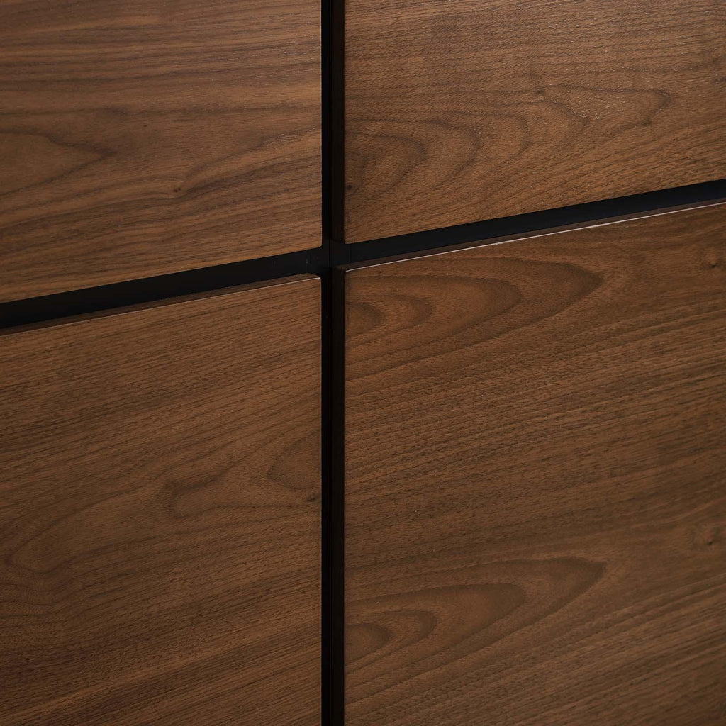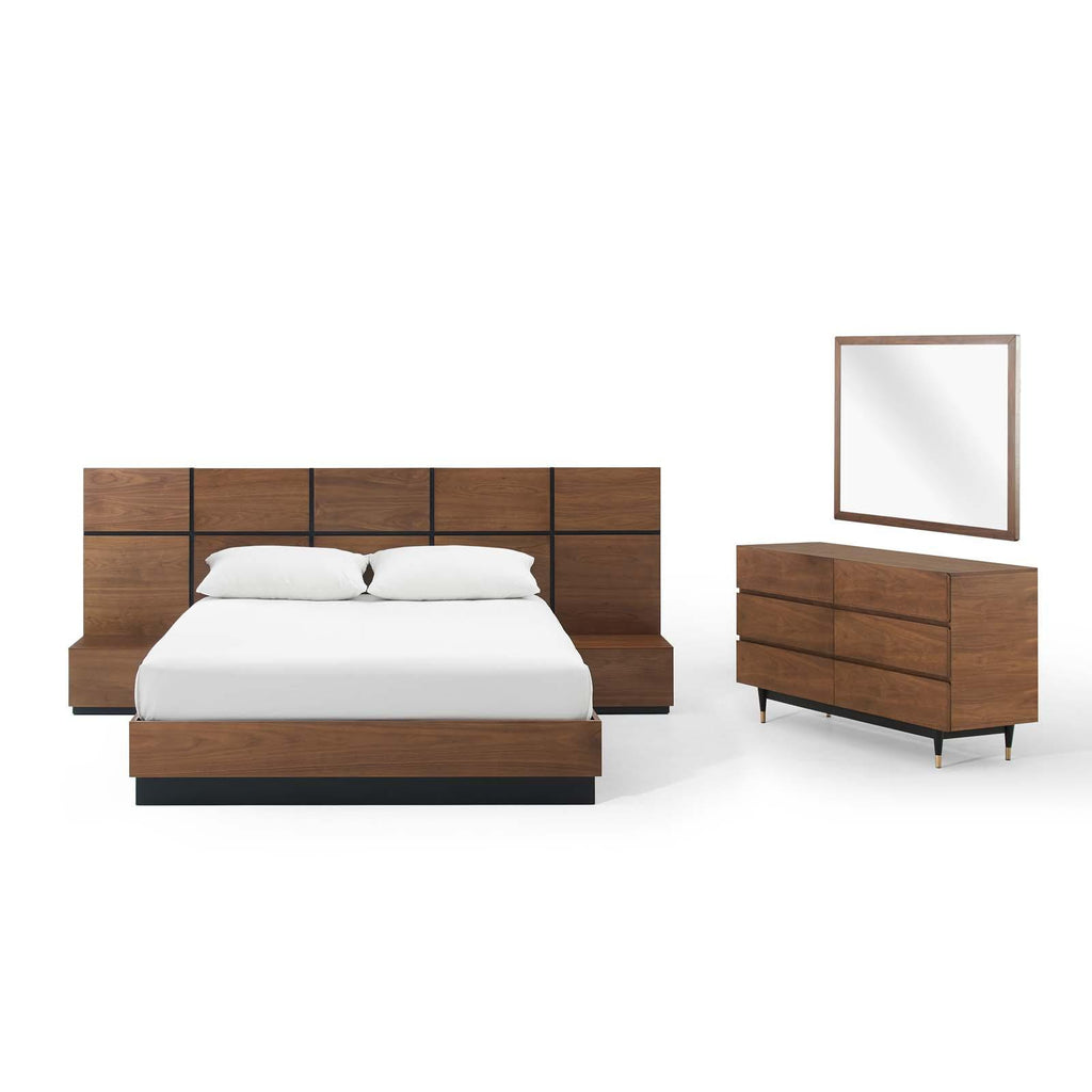 Introduce opulent energy to your bedroom decor with the elegantly distinguished Caima 5-Piece Bedroom Set featuring a queen bed, two nightstands, a mirror, and dresser. Solidly constructed from MDF and beautifully grained brown walnut veneer, the Caima Platform Bed claims center stage in your master suite or guest bedroom, while the nightstands feature spacious storage drawers. Accompanying the bed and nightstands is a spacious 6-drawer dresser and rectangular mirror. The Caima Queen Bed has a LVL wood slat support system and matte black painted MDF bed foundation. Rustic appeal exudes from within the interconnecting wood panels, allowing this wooden queen platform bed to focus your relaxation when reading, conversing, and reclining in bed. Assembly required, box spring not necessary. Set Includes: One - Caima 6-Drawer Dresser One - Caima Mirror One - Caima Queen Platform Bed Two - Caima Nightstand Mid-Century Modern Bedroom Set Queen Platform Bed Walnut Veneer Slatted Support System Assembly Required Solidly Constructed "Set Includes: Bed, 2 Nightstands, Mirror, Dresser" Overall Product Dimensions: 85"L x 120"W x 69"H Bed Dimensions: 85"L x 102.5"W x 41.5"H Headboard Dimensions: 2.5"L x 102.5"W x 41.5"H Footboard Dimensions: 0.5"L x 62.5"W x 11.5"H Side Rail Dimensions: 81"L x 61 - 62.5"W x 11.5"H Side Table Dimensions: 15.5"L x 19.5"W x 11.5"H Side Table Drawer Dimensions: 12.5"L x 16.5"W x 5.5"H Dresser Dimensions: 17.5"L x 47"W x 29.5"H Dresser Drawer Dimensions: 12.5"L x 20.5"W x 3.5"H Mirror Dimensions: 0.5"L x 31.5"W x 39.5"H