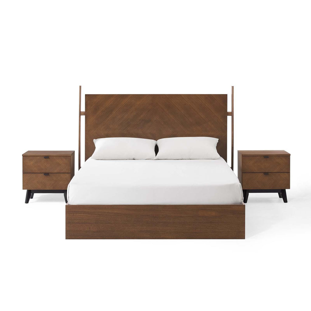 Redirect your bedroom decor with the edgy mid-century modern style of the Kali 3-Piece Bedroom Set featuring a queen bed and two nightstands. Kali's queen size headboard showcases beautifully grained brown ash wood veneer with a geometric chevron pattern and dual headboard posts. Solidly constructed from wood and MDF particleboard, the Kali Platform Bed features sturdy side rails updating your master suite or guest bedroom with a commanding presence, while the nightstands rest atop splayed black legs and feature dual storage drawers. The Kali Queen Bed features a slatted support system creating a sturdy mattress foundation for memory foam, latex, hybrid, and innerspring mattress types. Claim center stage in your bedroom and relax with the Kali Wood Queen Platform Bed while reading, conversing, and reclining in bed. Assembly required, box spring not necessary.
