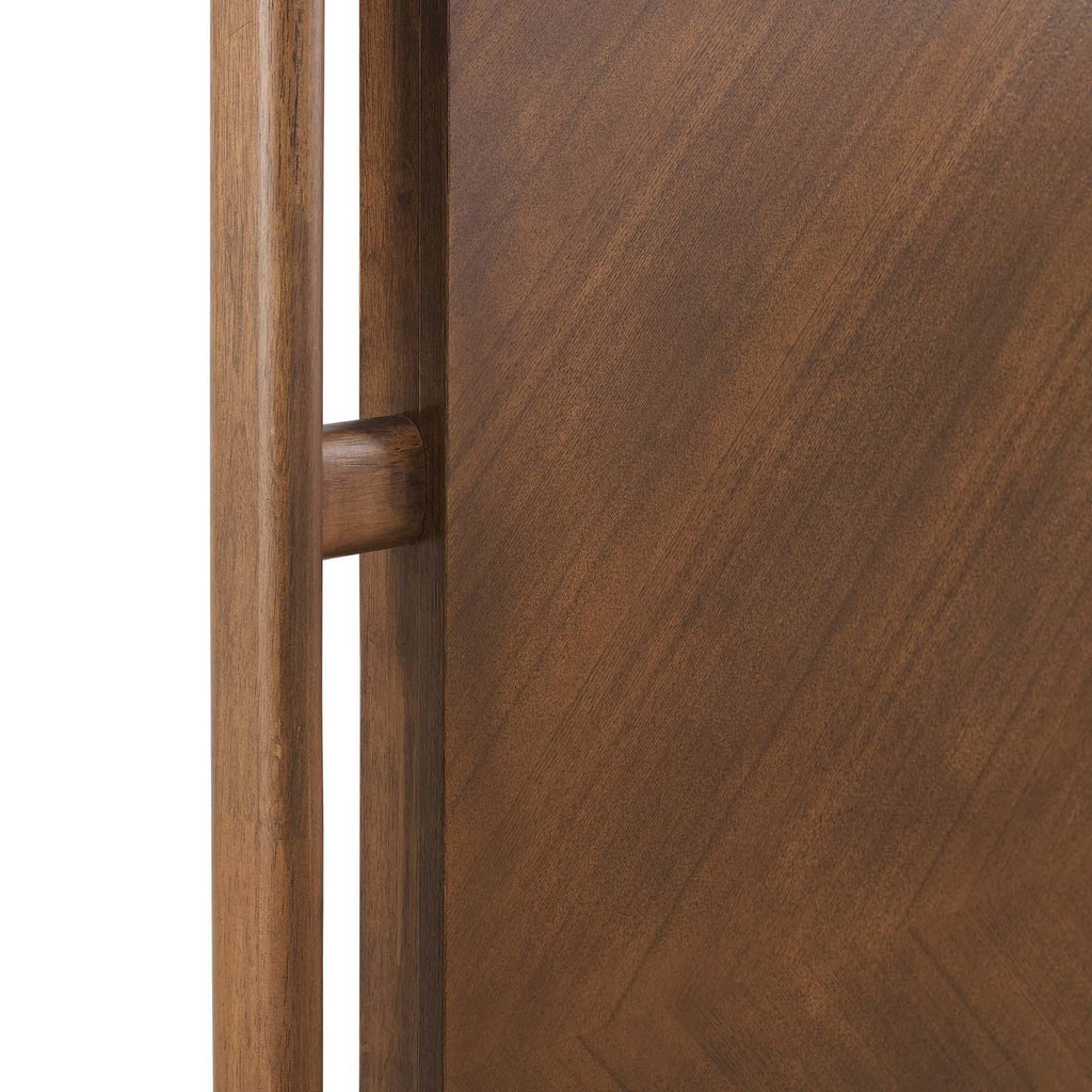 Redirect your bedroom decor with the edgy mid-century modern style of the Kali 6-Piece Bedroom Set featuring a queen bed, two nightstands, a dresser, chest, and mirror. Kali's queen size headboard showcases beautifully grained brown ash wood veneer with a geometric chevron pattern and dual headboard posts. Solidly constructed from wood and MDF particleboard, the Kali Platform Bed features sturdy side rails updating your master suite or guest bedroom with a commanding presence, while the nightstands rest atop splayed black legs and feature dual storage drawers. Accompanying the bed and nightstands is a spacious 6-drawer dresser, a mirror, and 5-drawer chest. The Kali Queen Bed features a slatted support system creating a sturdy mattress foundation for memory foam, latex, hybrid, and innerspring mattress types. Claim center stage in your bedroom and relax with the Kali Wood Queen Platform Bed while reading, conversing, and reclining in bed. Assembly required, box spring not necessary.