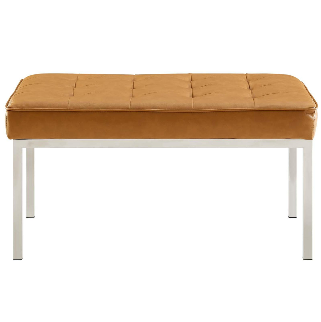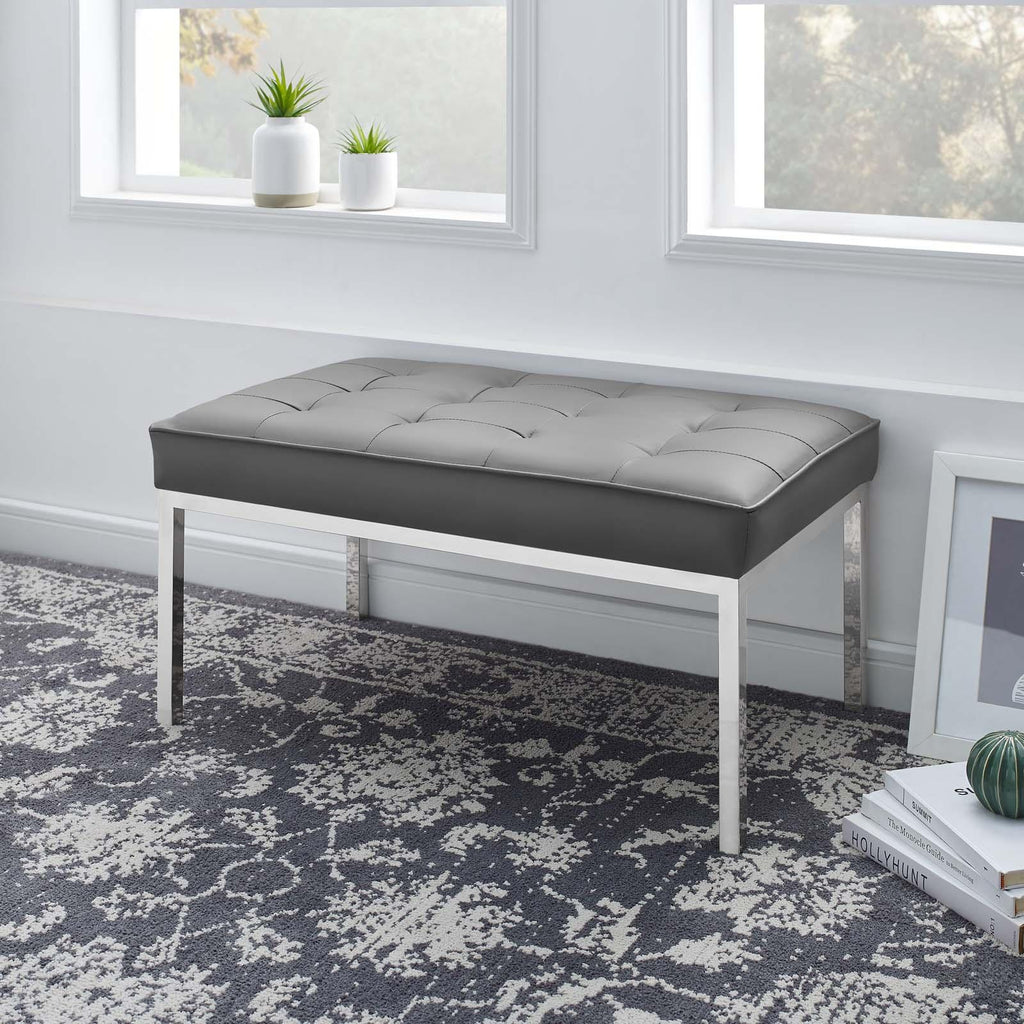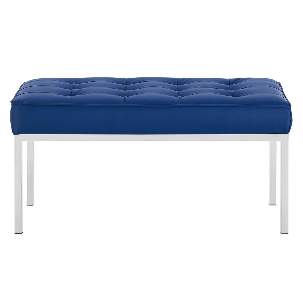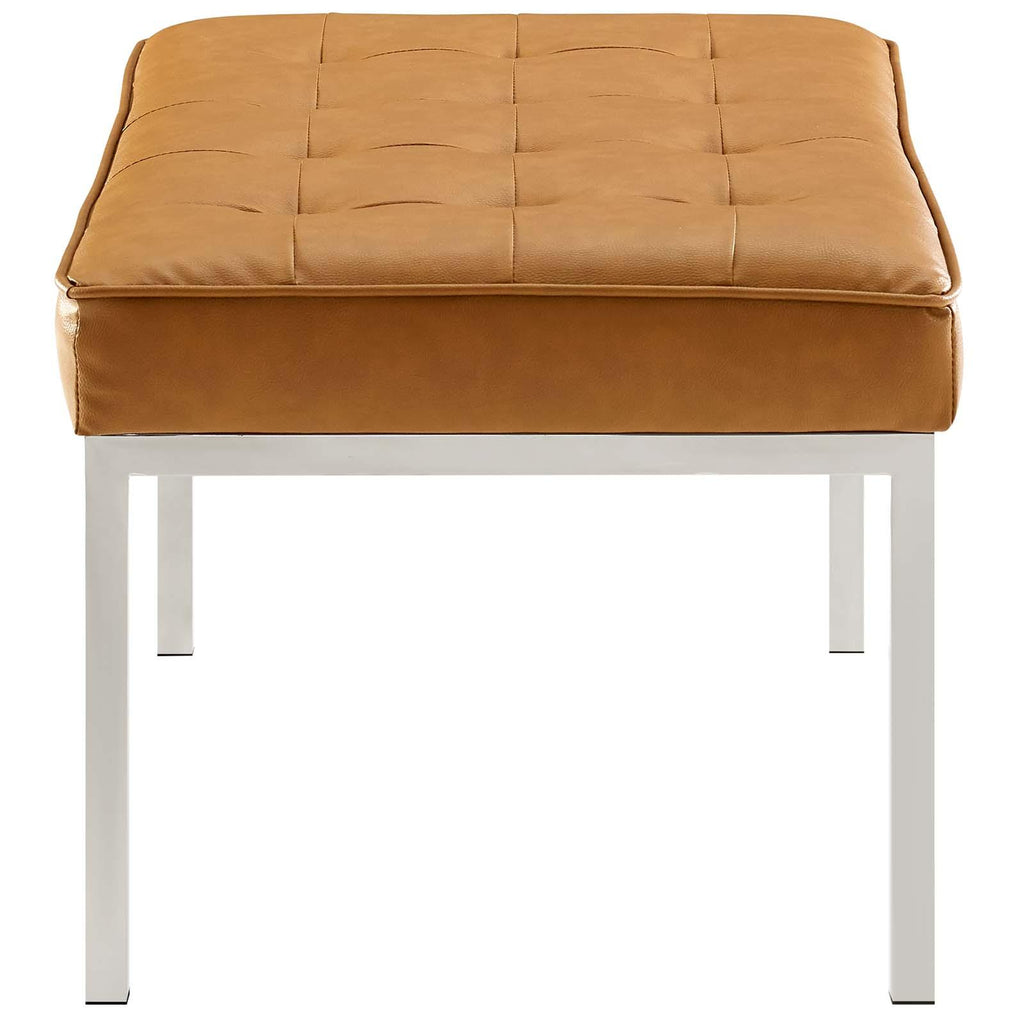 Revolutionize your living room furniture with the iconic Loft Tufted Faux Leather Medium Accent Entryway Bench. Adding visual depth to your living room or lounge space, Loft features soft and durable faux leather upholstery accented in elegant button tufting. This modern living room accent bench comes in a captivating linear design with an external tubular stainless steel frame, four stainless steel silver legs, and non-marking foot caps. Inspired by the richness of mid-century modern style, Loft is the preferred choice of living rooms and lounge spaces. Bench Weight Capacity: 300 lbs.