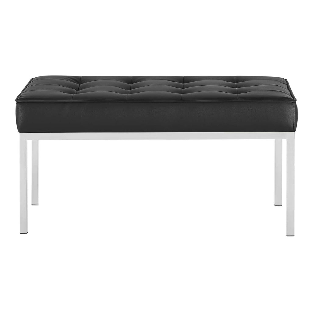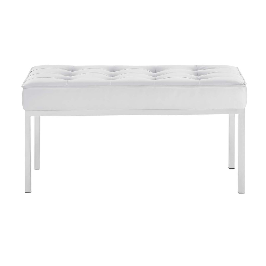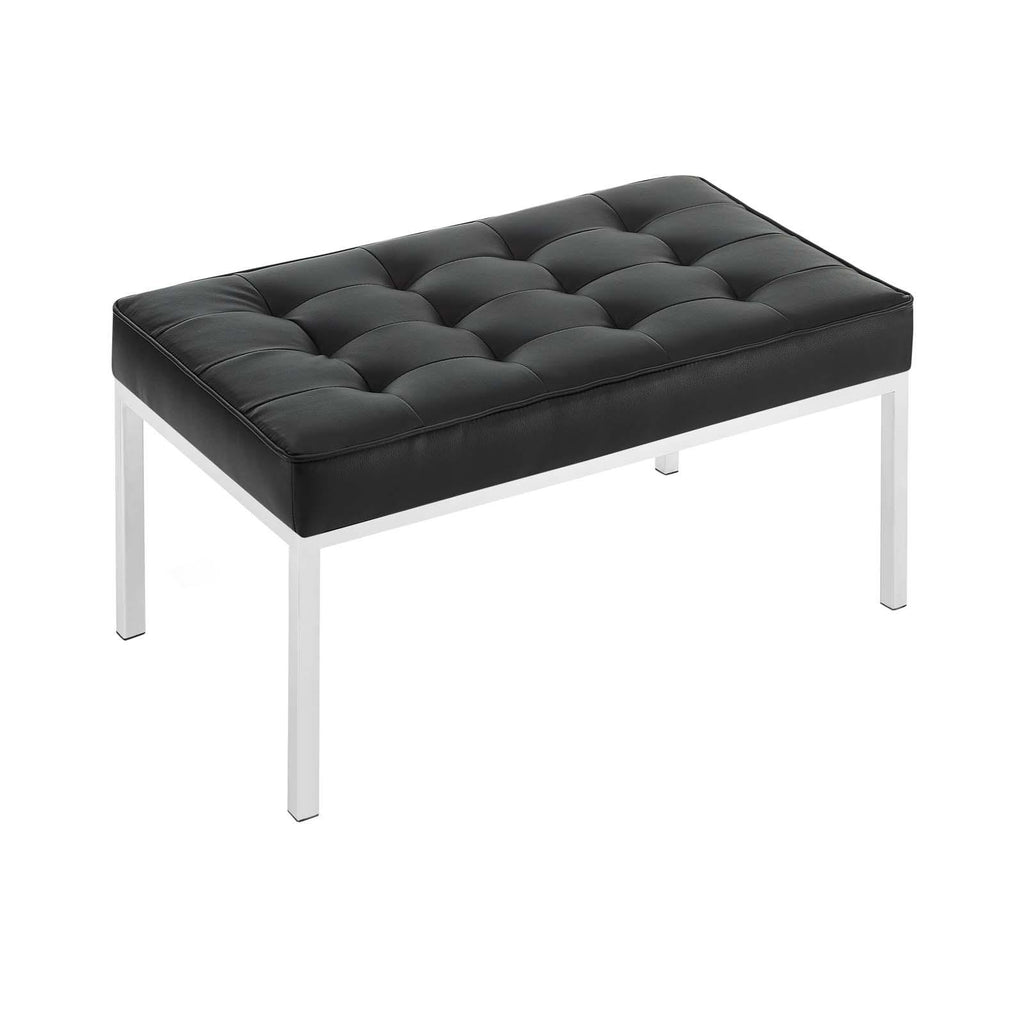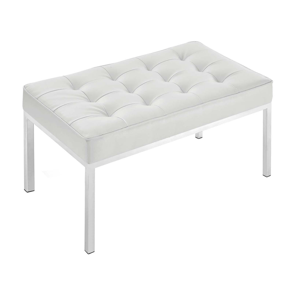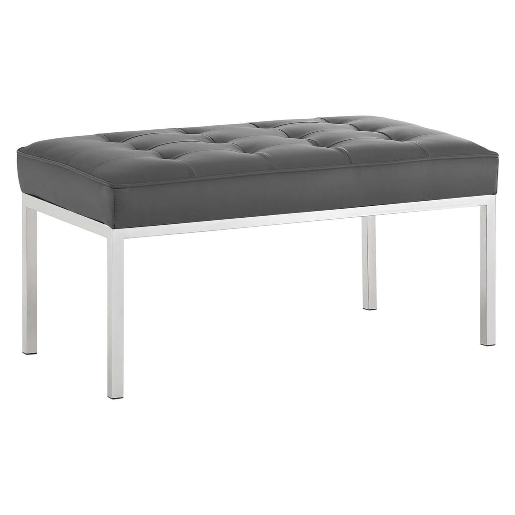 Revolutionize your living room furniture with the iconic Loft Tufted Faux Leather Medium Accent Entryway Bench. Adding visual depth to your living room or lounge space, Loft features soft and durable faux leather upholstery accented in elegant button tufting. This modern living room accent bench comes in a captivating linear design with an external tubular stainless steel frame, four stainless steel silver legs, and non-marking foot caps. Inspired by the richness of mid-century modern style, Loft is the preferred choice of living rooms and lounge spaces. Bench Weight Capacity: 300 lbs.