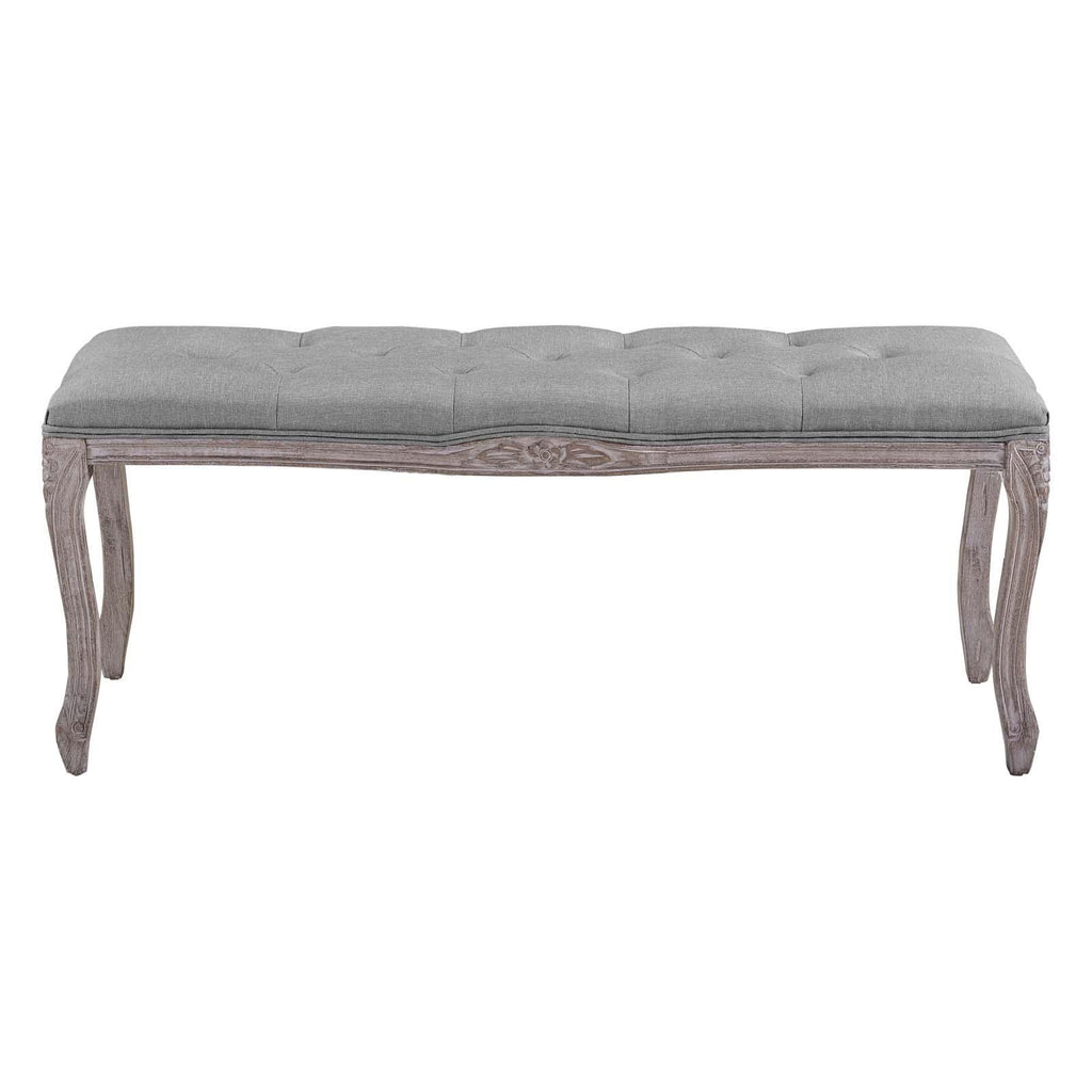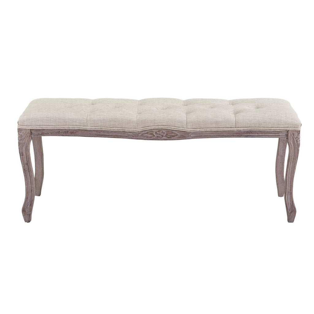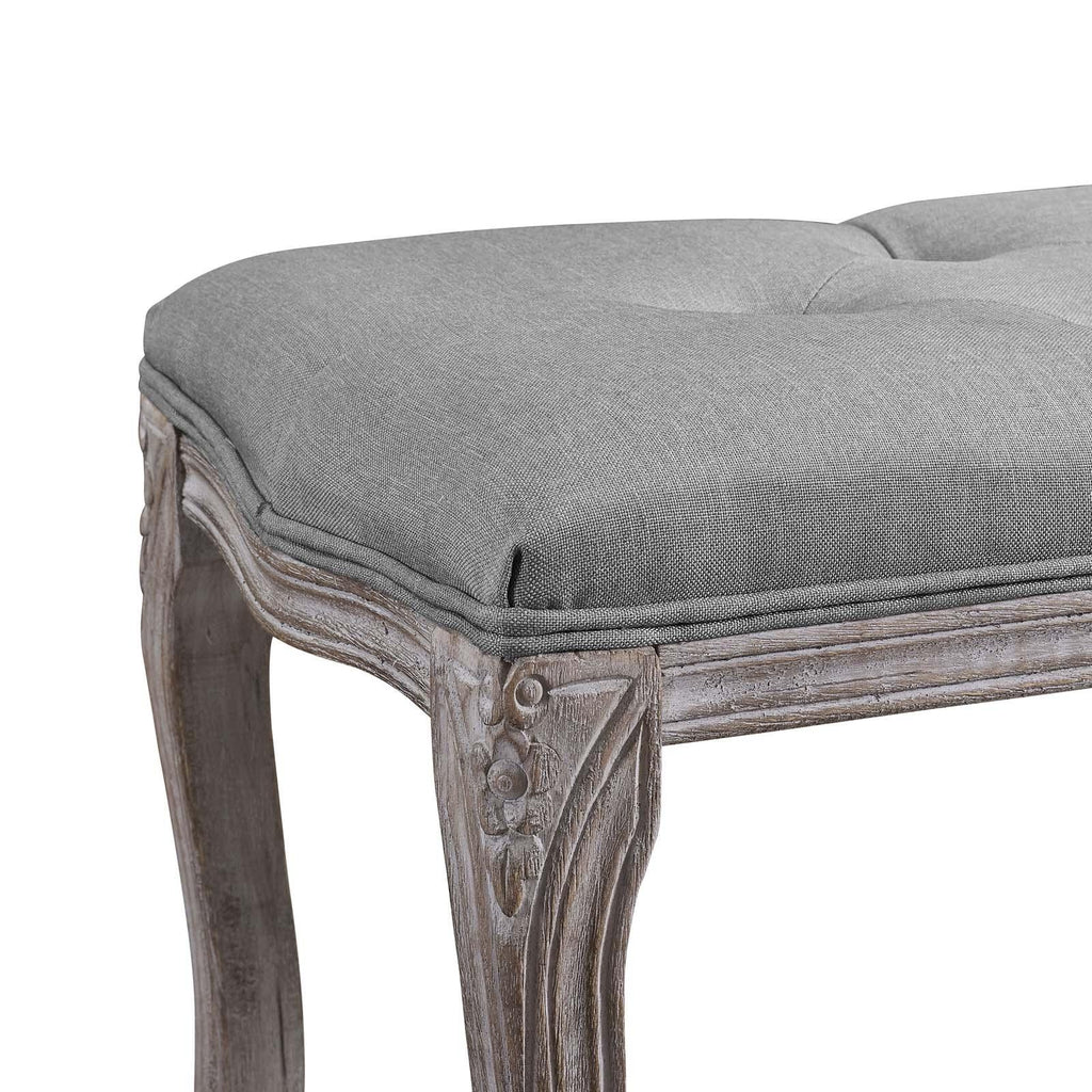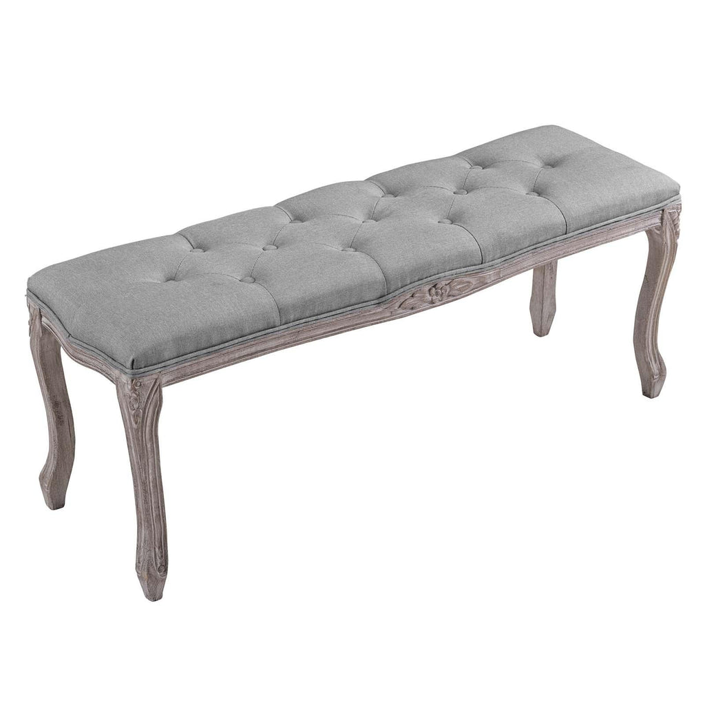 Revel in the whispered opulence of the Regal Upholstered Bench. Featuring a fluted wood frame with elegant cabriole legs, dense foam upholstered fabric seat with welting and button tufting, this bedroom or entryway bench harmoniously blends old world charm with modern intrigue. Designed with a weathered vintage French look and an undeniable appeal, Regal supports up to 331 pounds and comes with foot pads to preserve flooring. Comes fully assembled.