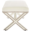 Add charm to your home or apartment d�cor with the Rivet Performance Velvet Accent Bench. Featuring timeless nailhead trim, an elegant X-base frame, and surrounded by stain-resistant performance velvet fabric with dense foam padding, Rivet is a perfectly soft and cozy bench for the chic modern lifestyle. Rivet is available in a variety of engaging colors and is the perfect addition to bed, living, and lounge rooms. Bench Weight Capacity: 331 lbs Set Includes: One - Rivet Bench Chic Modern Upholstered Fabric Bench Silver and Copper (Ivory Ottoman) Nailhead Trim Performance Velvet Upholstery Dense Foam Padding Bench Weight Capacity: 331 lbs. Assembly Required Overall Product Dimensions: 20"L x 42"W x 19"H Seat Dimensions: 20"L x 42"W x 19"H