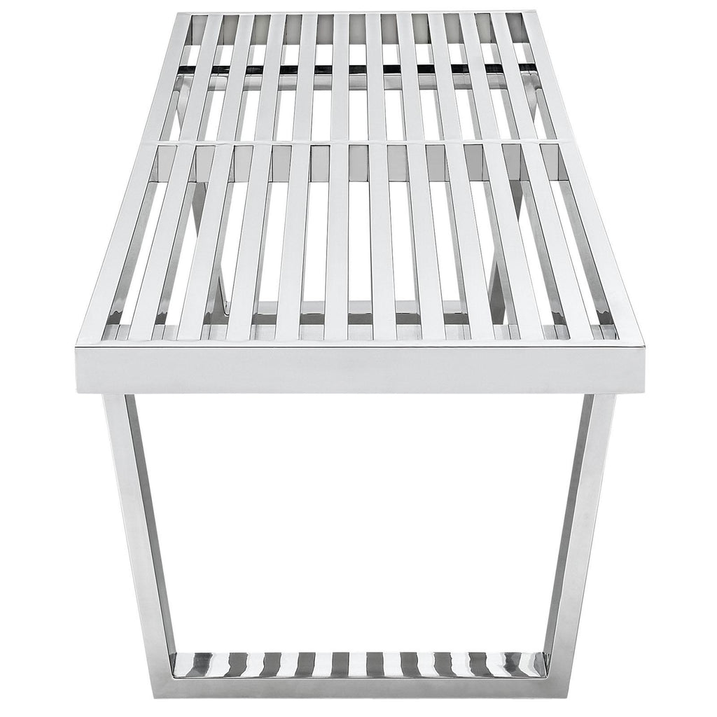 The Sauna is one of those elusively modern pieces. On the one hand, it�s a sound and functional offering serving as either a bench, platform base, or table. But in typical mid-century modern style, the design is also fully indicative of progress. The question then becomes how a practical piece became a symbol of limitless creativity? How a bench that still remains very much in tomorrow, graces the rooms of many homes and hotspots today? In order to propose an answer, we need to first look into the specifics. The surface is comprised of a slotted square rectangular design. While the base is constructed of solidly welded pieces of metal, there are no legs in the classic understanding of legs. Also, the vertical metal slats of metal are slanted. This then is our answer. Imagine if you were vested with the task of making a mid-century modern bench. It was to be fully practical because otherwise, the pragmatists among you would belittle it. But hidden beneath the functionality, the trial would be to portray the uncertain future that was yet to be. What made the Sauna bench an icon is the same reason you have opted to buy it today. Why is this still the bench of tomorrow? Because if you were asked to envision a bench for the next 50 years, there is a good chance it will look something like this. Set Includes: One - Sauna 5' Platform Bench in Stainless Steel Polished Stainless Steel Sturdy Construction Solid Stainless Steel Legs Overall Product Dimensions: 60"L x 18"W x 14"H