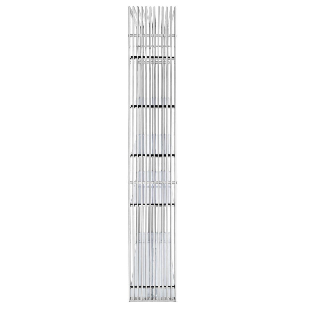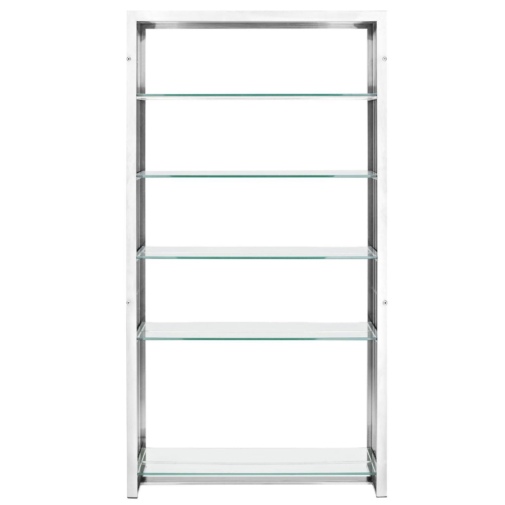 The conduit design of this Gridiron series installment artfully blends stainless steel tubing with five tempered glass shelves. Modernism used to be about extremes. Wild shapes and patterns that don�t dare resemble its predecessors. We�ve reached an age of maturity of sorts. We appreciate style, but all the more, we respect those designs that represent a blending of cultures. The Gridiron stainless steel shelving unit is famous not for its radical shape, but for the strategic transcendence that it provides. Set Includes: One - Gridiron Stainless Steel Stand Perfect Modern Shelving Unit Stainless Steel Construction Five Tempered Glass Shelves Easy to Clean There are five shelves. Assembly Required Overall Product Dimensions: 39.5"L x 11.5"W x 71"H Shelf Dimensions: 37.5"L x 10"W x .5"H Bottom Shelf Height: 19.5""H Middle Shelves Height: 11.5"H