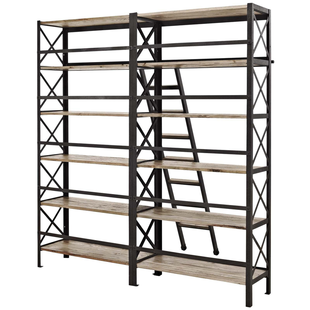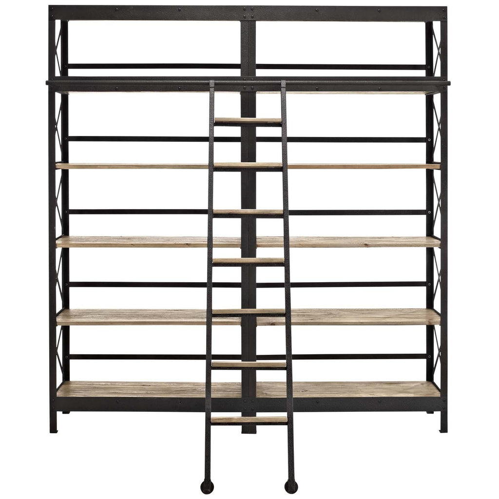 Gain ground through the rising tide of the process with the Headway industrial modern shelving unit and ladder. Constructed with solid pine wood shelves and a cast iron frame, Headway advances your d�cor from the onset of assembly lines into our present era of discovery. The ladder is sold together so as to connote progress both on and off the shelf. Set Includes: One - Headway Wood Stand Industrial modern shelving unit Solid pine wood shelves (stained but not sealed) Comes with ladder Cast iron frame Assembly required Actual wood color may vary Overall Product Dimensions: 84"L x 16"W x 90"H Overall Ladder Dimensions: 2"L x 15.5"W x 78.5"H Space Between Shelves: 16"H Distance Ladder Extends From Shelves: 35.5"L Width of Shelves(each wooden panel): 42"W