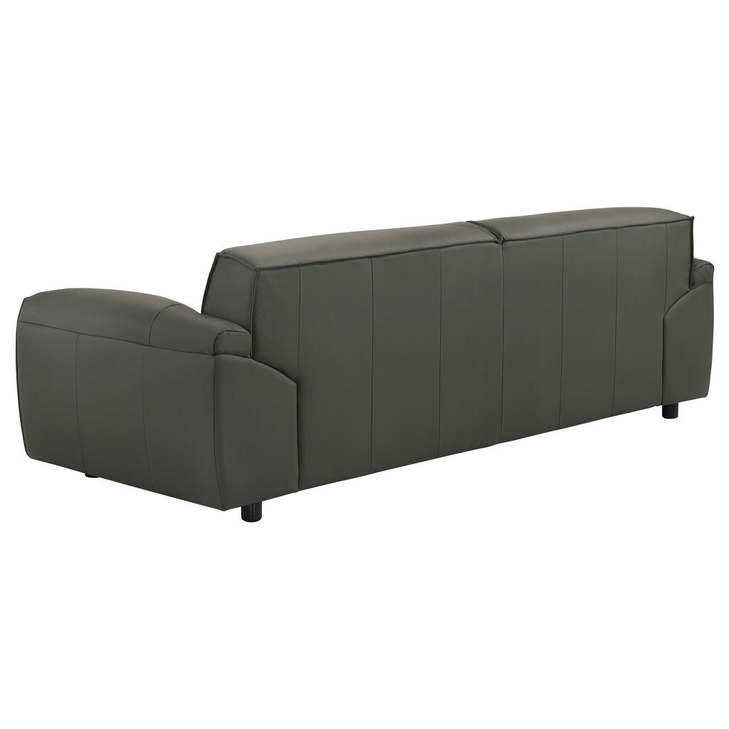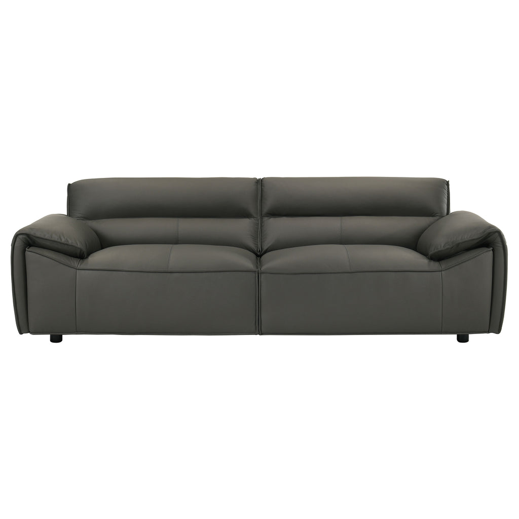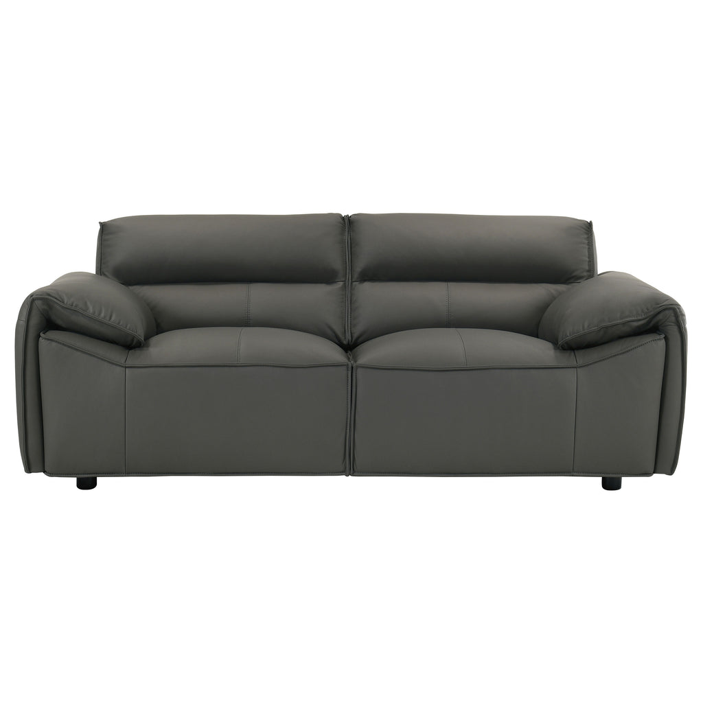Refined and sculptural, this leather sofa set blends modern minimalism with deep, enveloping comfort. Upholstered in 100% genuine top grain leather, each piece features wide, gently sloped arms and a low-profile frame that grounds the room with effortless presence. Deep seat cushions are filled with high-density full foam and supported by sinuous springs, creating a balanced feel that’s both structured and soft. Tailored yet inviting, this two-piece set is crafted to elevate comfort with enduring sophistication. Key Features: • Two-piece sofa set includes a full-size sofa and loveseat with sculpted low-profile silhouettes • Upholstered in 100% top grain leather for breathable softness and lasting luxury • Wide, gently sloped arms offer relaxed comfort with a modern architectural edge • High-density full foam cushions provide deep, plush seating with durable structure • Sinuous spring seat foundation ensures consistent support and responsive comfort • Orange leather finish adds bold contrast and timeless character to any space