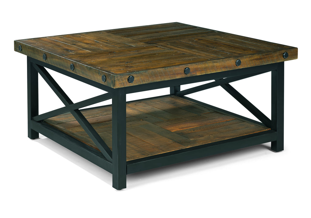 Transform your living room into a casual, modern rustic haven with the Carpenter square coffee table. A roomy top keeps cocktails and snacks conveniently close at hand, while an open lower shelf provides additional space for books or dŽcor. Made with acacia wood, this coffee table features a well-worn look that is highlighted by a dark brown finish. Other design details include wood planks that are distressed for a reclaimed look, hand-worked metal frames and exposed bolt heads.