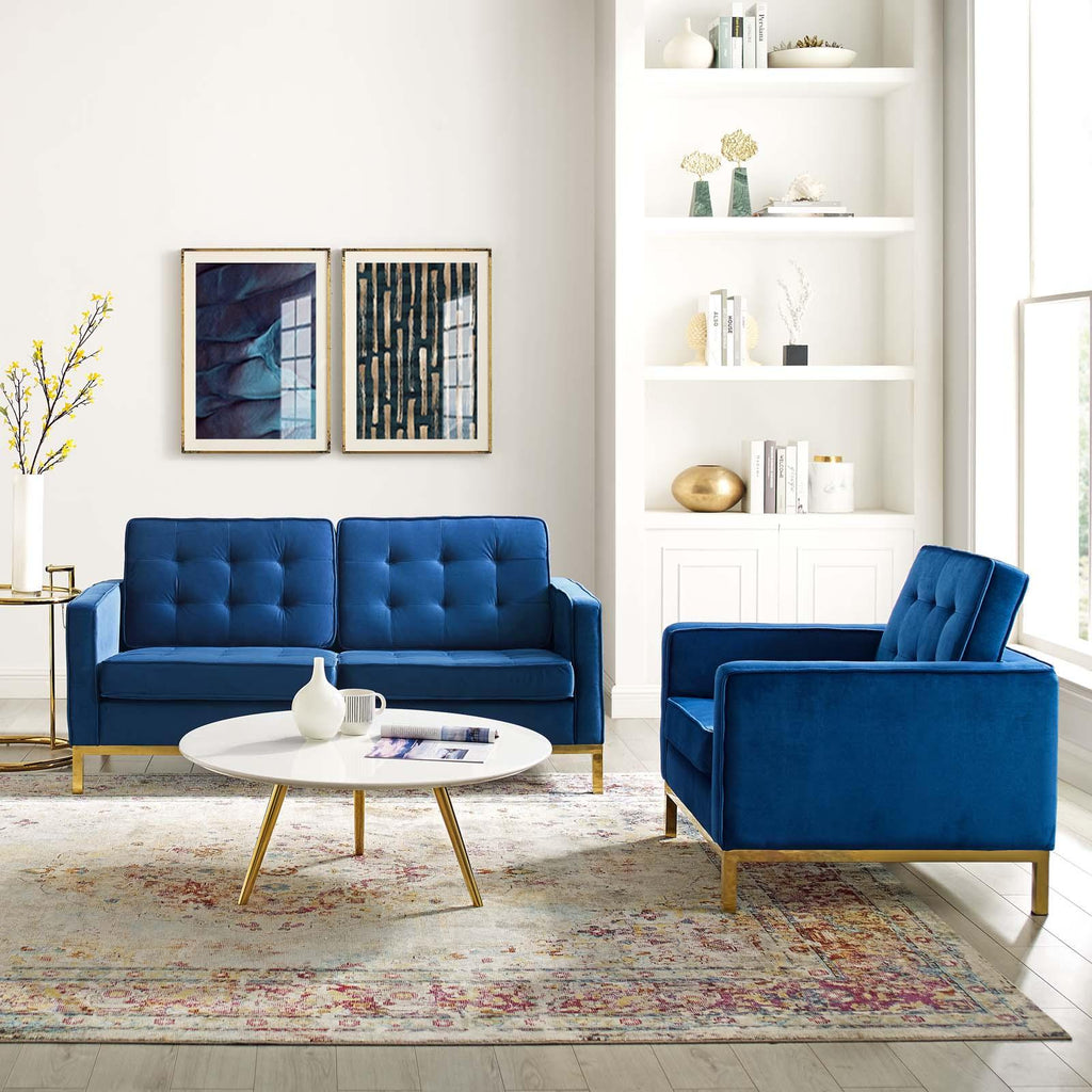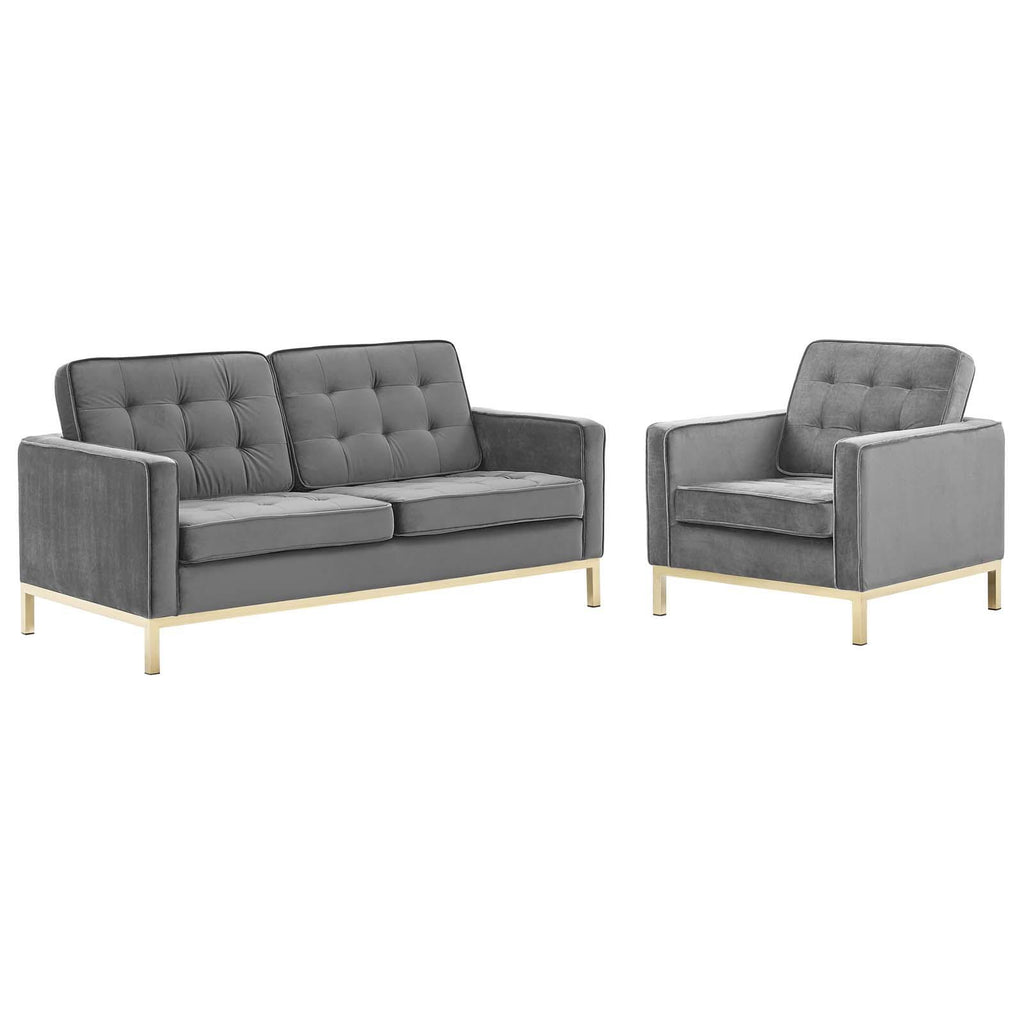 Revolutionize your living room furniture with the iconic Loft Gold Stainless Steel Leg Performance Velvet Loveseat and Armchair Set. Adding visual depth to your living room or lounge space, Loft features soft and durable performance velvet upholstery accented in elegant button tufting. This retro modern living room set comes in a captivating linear design with an external tubular stainless steel frame, four gold stainless steel legs, and non-marking foot caps. Inspired by the richness of mid-century modern style, Loft is the preferred choice of living rooms and lounge spaces.