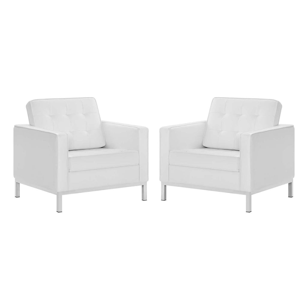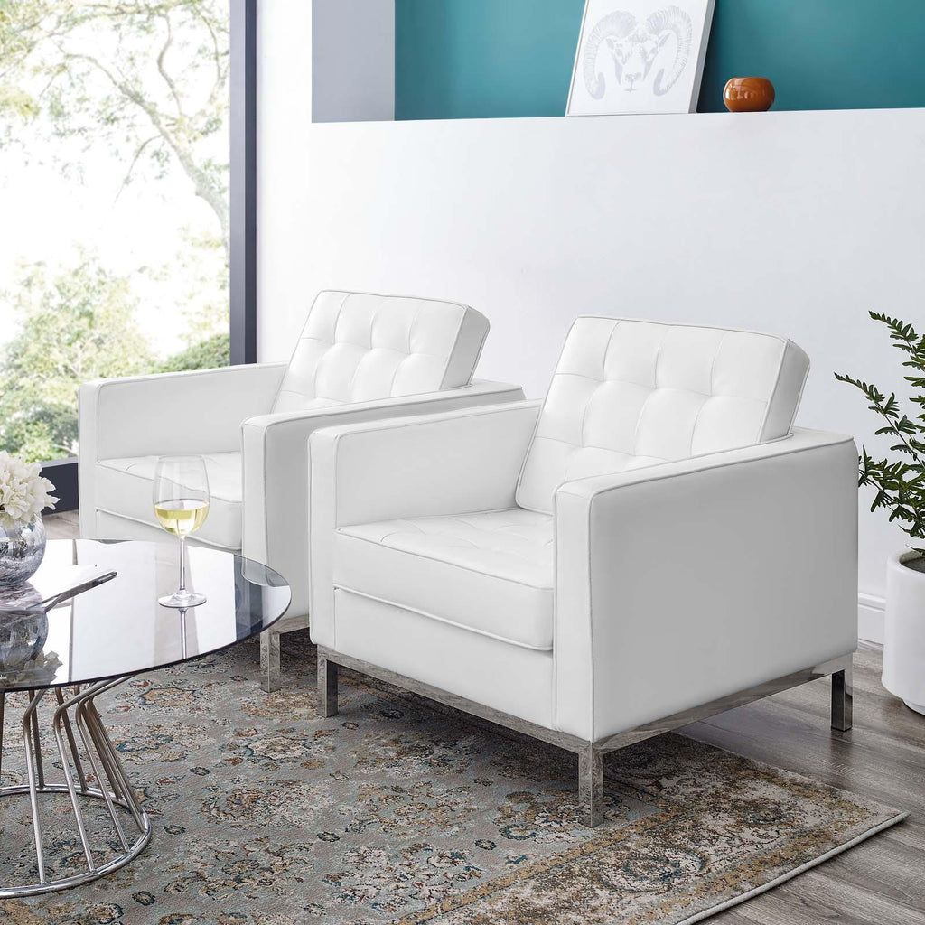 Revolutionize your living room furniture with the iconic Loft Tufted Faux Leather Medium Accent Armchair Set of 2. Adding visual depth to your living room or lounge space, Loft features soft and durable faux leather upholstery accented in elegant button tufting. This modern living room chair set comes in a captivating linear design with an external tubular stainless steel frame, four stainless steel silver legs, and non-marking foot caps. Inspired by the richness of mid-century modern style, Loft is the preferred choice of living rooms and lounge spaces.
