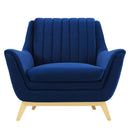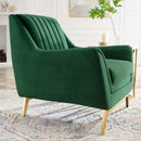 Bring rich tactiles and vintage modern charm to your living space with the Winsome Channel Tufted Performance Velvet Armchair. Putting a glam deco twist on a classic mid-century modern design, this accent chair features vertical channel tufting on the backrest, gold metal detail, and a flared silhouette. Covered in stain-resistant performance velvet, this upholstered armchair is padded with dense foam and complete with a no-sag pocket coil spring support system. With a solid wood and plywood frame, this velvet chair rests on gold stainless steel legs with plastic foot glides and supports up to 300 lbs. Set Includes: One - Winsome Channel Tufted Armchair Channel Tufted Armchair Stain-Resistant Performance Velvet Dense Foam Padding Pocket Spring Support Solid Wood and Plywood Frame Gold Stainless Steel Legs Weight Capacity: 300 lbs. Overall Product Dimensions: 34"L x 38.5"W x 33.5"H Seat Dimensions: 22.5"L x 24.5"W x 17.5"H Backrest Dimensions: 24.5"W x 16"H Armrest Dimensions: 22.5"L x 5"H Leg Dimensions: 6.5"H