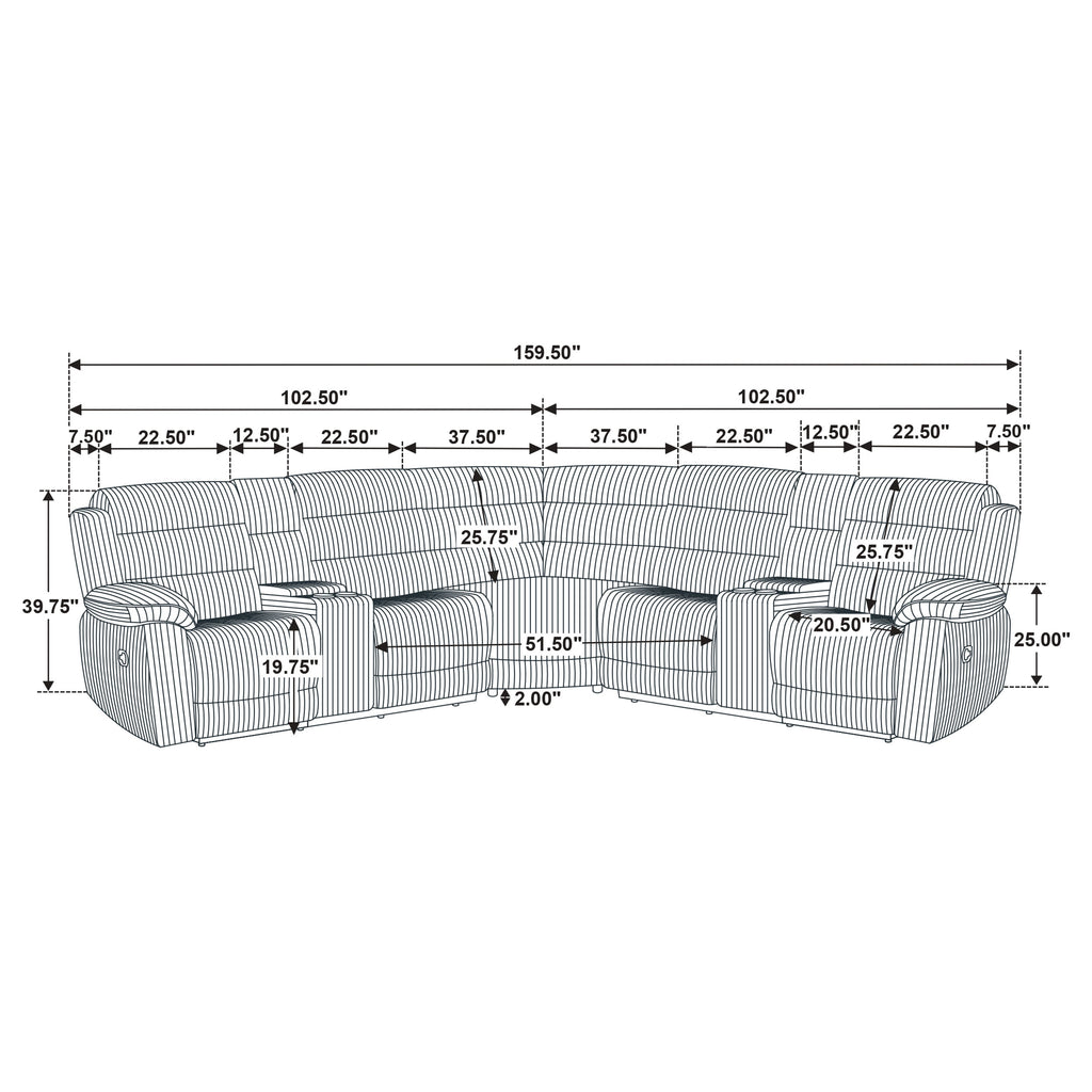 Unwind in sculpted comfort with this reclining sectional sofa, where bold texture meets irresistible softness. Wrapped in wide-wale corduroy upholstery, its velvety ribbed finish creates visual depth and an inviting touch. Deep channel tufting enhances the plush profile, while dual consoles offer lift-top storage and stainless steel cup holders. With pocket coil seating beneath every cushion, this sectional is a luxurious retreat for everyday lounging and connection. Key Features: • Reclining sectional sofa with sculpted profile and ribbed channel tufting throughout each panel • Chocolate brown wide-wale corduroy upholstery offers soft velvety texture and elevated visual interest • Two reclining seats provide effortless comfort with smooth manual motion functionality • Pocket coil seating ensures enduring structure, bounce, and all-day supportive comfort • Two center consoles with lift-top storage and removable stainless steel cup holders included • Reinforced with soft fabric, foam cushioning, and sturdy metal framework for lasting use