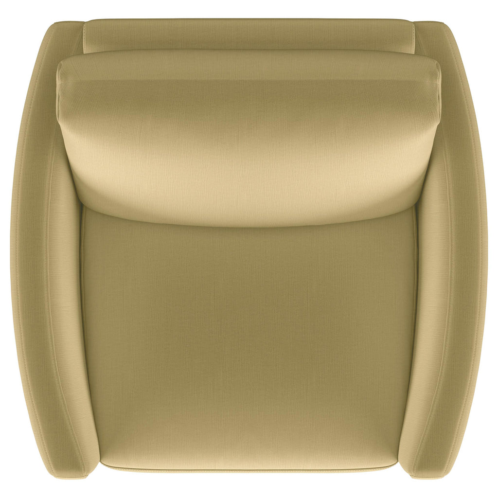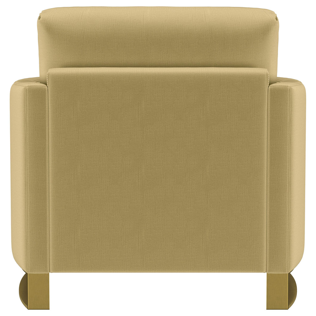 Indulge in opulent comfort with this textured velvet chair. Its reversible feather blend seat and back cushions, complemented by curved arms and gold stainless steel legs. Smooth upholstery and lustrous details blend simplicity with timeless splendor, making this piece a perfect focal point for refined interiors. With its inviting profile and graceful presence, it elevates both style and relaxation. Key Features: • Chair with plush seating designed to elevate both comfort and style • Textured velvet finish in a warm camel hue • Reversible feather blend cushions ensure adaptable support • Curved arms and gold-accented stainless steel legs add subtle luxury • Fully encased engineered wood frame with sinuous springs and pocket coils • Reversible seat and reversible back cushion for easy maintenance