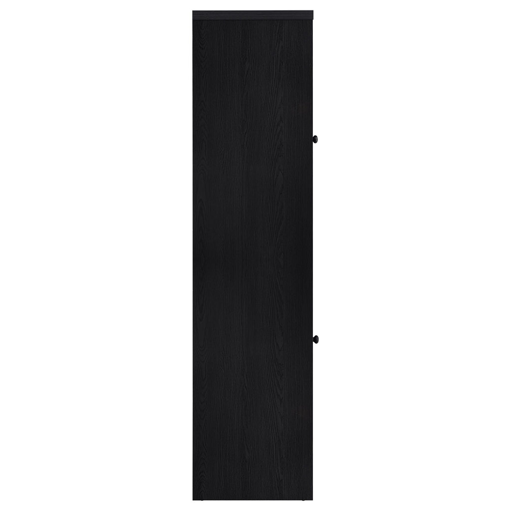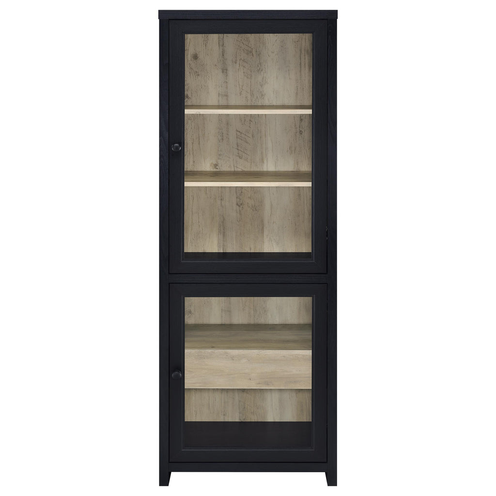 Elevate your space with a media tower that blends quiet elegance and thoughtful design. Wrapped in a bold black finish, this two-door cabinet reveals a rich interior contrast and graceful utility. Framed glass doors showcase your favorite pieces above, while a hidden drawer below offers a secret haven for everyday essentials. Whether you're curating a display or storing away the everyday, this tall, slender silhouette adds a refined presence to any corner it inhabits. Key Features: • Two-door media tower with black frame and warm wood-look interior finish • Upper cabinet includes two adjustable shelves for versatile display • Lower cabinet includes one drawer for concealed storage of small items • Clear framed glass doors enhance visibility while protecting contents • Gunmetal hardware adds subtle industrial contrast to the modern silhouette • Constructed from engineered wood, melamine veneer, and tempered glass for durability