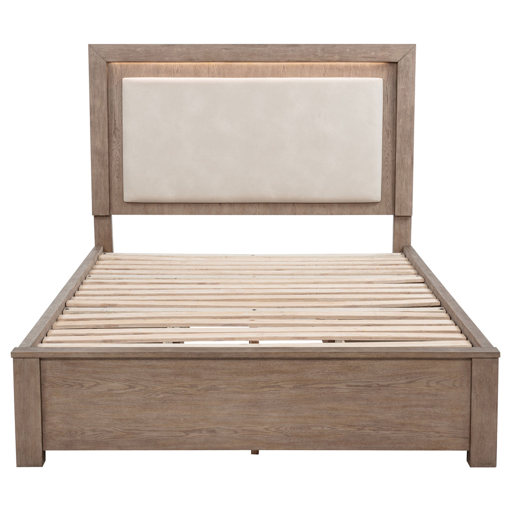 Make the most of every inch in your stylish bedroom with a modern four-drawer wooden bed that includes an upholstered headboard with LED lighting for easy ambiance. The bed boasts a barley brown finish over wood grain details, creating a soft, neutral palette with organic flair. Four drawers are tucked underneath platform slats, creating ample storage that's perfect for everything from clothing and linens to personal items. The bed is defined with a squared headboard that features an upholstered panel with foam cushioning and beige upholstery, perfect for lounging with a book or movie. Built-in LED lighting is a perfect complement, adding soft, inviting ambiance in your bedroom. Key Features: • Four roomy drawers add easy storage to a modern wooden bed with an upholstered headboard • Built-in LED lighting adds ambiance and fresh, contemporary appeal to a squared headboard • Headboard features an upholstered panel with foam cushioning and neutral beige fabric • Barley brown finish is soft and neutral, offering a fresh palette for the linens of your choice • Four drawers are complete with chrome finish bar pulls that add a touch of contrast