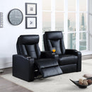 Build your ultimate home theater with this two-seat recliner from the Pavillion Collection. Upholstered in a sleek black leather, these seats are designed for premium style and comfort, with a sleek track arm and metal chrome cup holders. Plush high-back cushions and adjustable headrests ensure you stay comfortable for hours. Get your room ready for your next movie night with this two-seat set! Length: 68.0 Width: 42.0 Height: 42.25