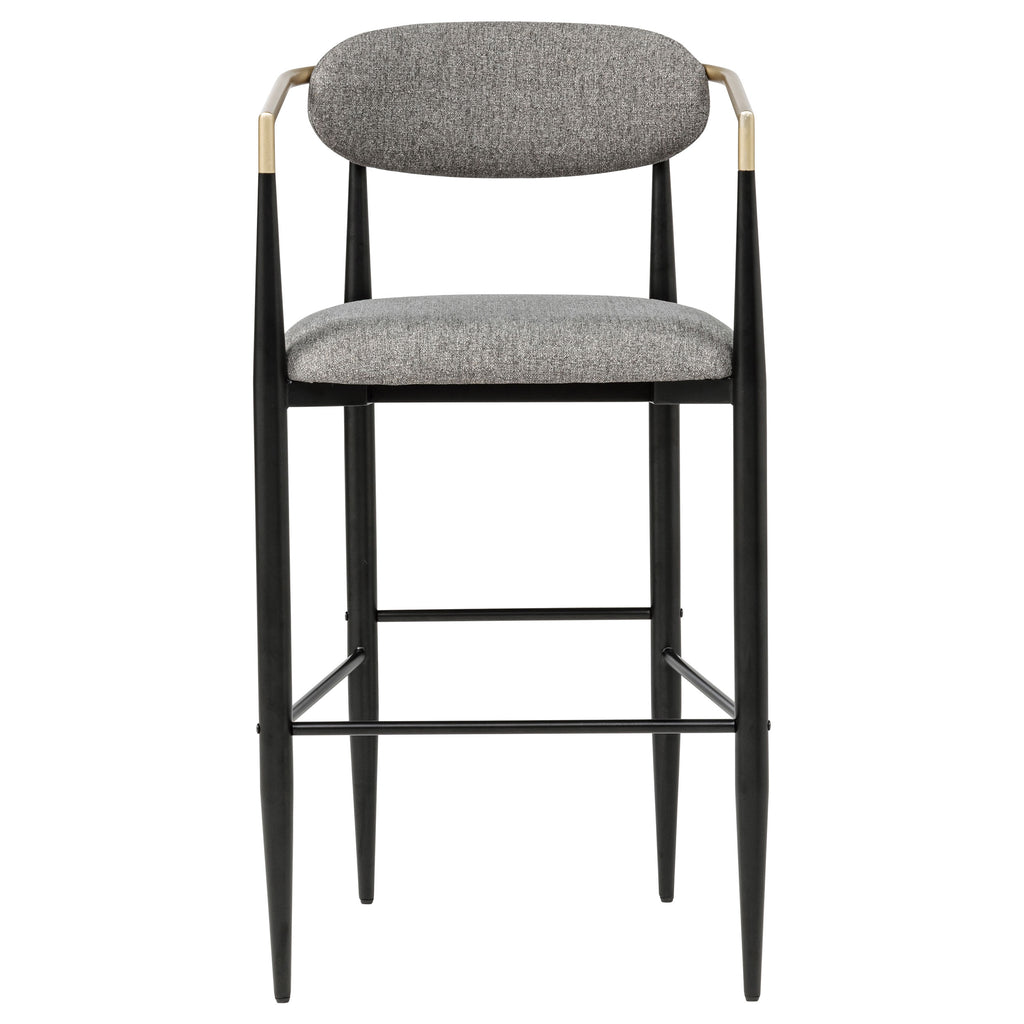 Take your kitchen or dining room decor to stylish new heights with the mid-century flair of a set of two modern barstools. Each offers an airy, open silhouette with its pairing of a plush seat and slender backrest, both with foam cushioning and stylish upholstery. The gentle curvature of the seatback continues in slim arms that receive a gold finish that complements both the fabric and the black finish of the base. The base of each barstool offers tapering legs and slim support bars that create a built-in footrest for added comfort and support. This plush barstool is the ideal solution to a bar table in a relaxed dining room or a home lounge in need of elevated style. Key Features: • Mid-century character infuses a set of two modern bar height stools with tempting style • Open back with a padded backrest creates a light, airy ambiance in youth kitchen or dining room • Plush padded seat features foam cushioning with soft upholstery • Black finish base features a tapering design w built-in footrest for added comfort and support • Slim arms add a gold finish for a touch of contrast and depth