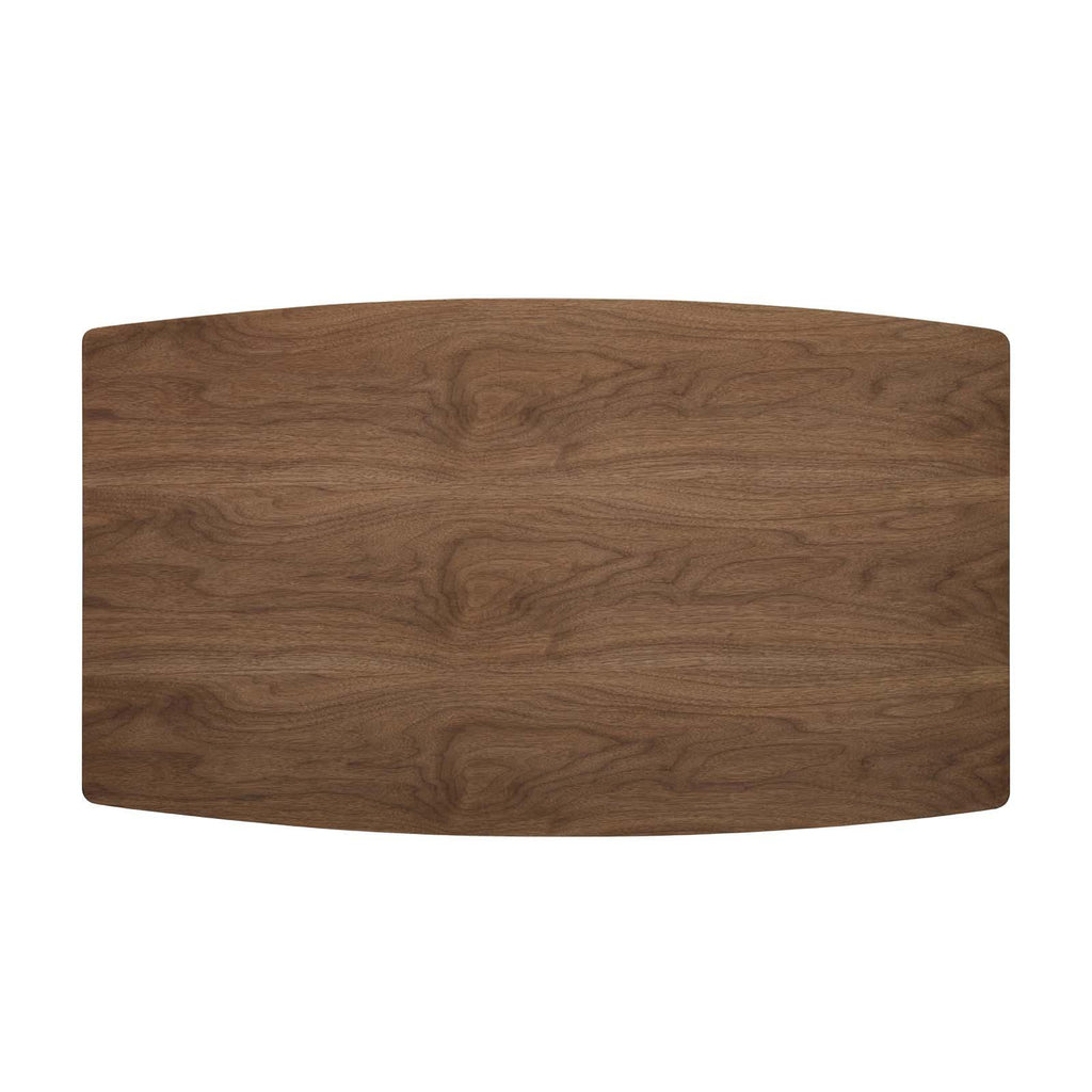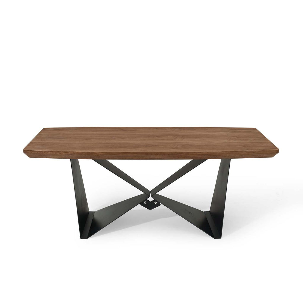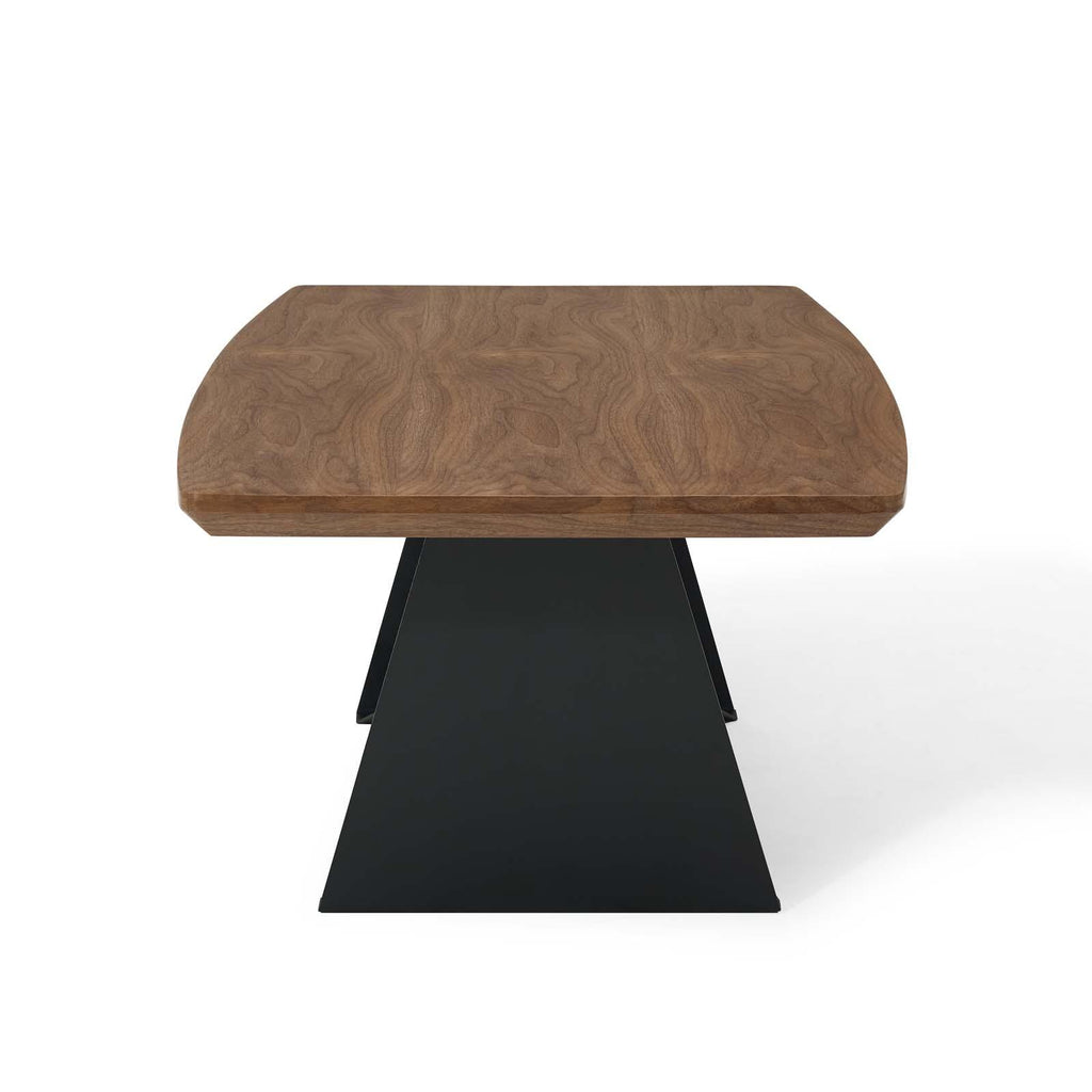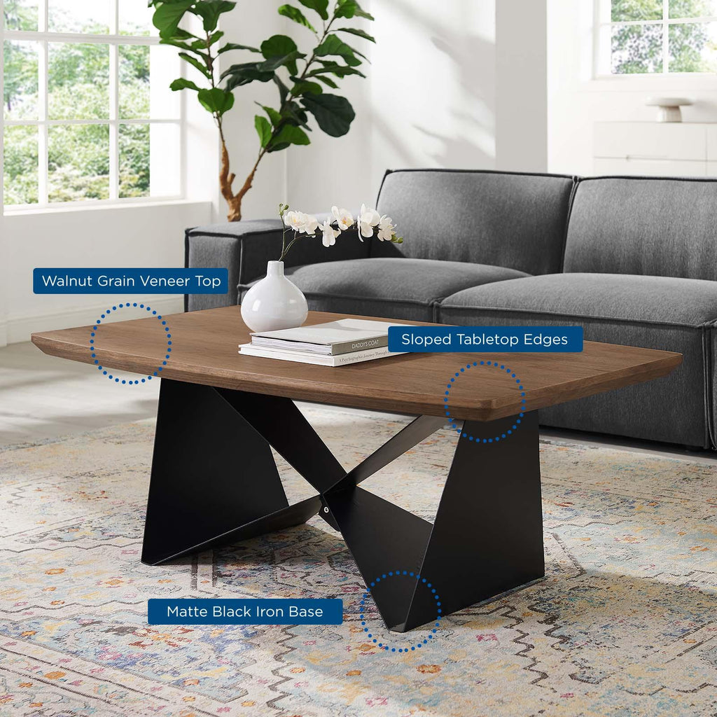 Angular expanse rises gracefully from the Gemini Coffee Table. The rectangular walnut grain veneer top with subtle curved edges is supported by an intersecting matte black iron base with non-marking foot caps. The Elevate Coffee Table is an eye-catching addition to your living room decor, and its versatile construction features elegance suitable for an office space or bedroom sitting area. Solidly crafted from wood and MDF, this coffee table boasts sloped edges and striking angular detail. Assembly Required.
