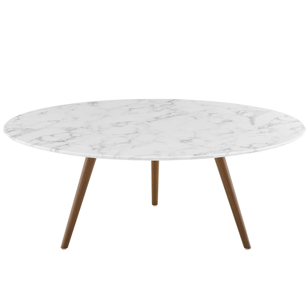 Reflecting a seamless organic shape and timeless form, the Lippa Table has become a symbol of modernism for over the past 60 years. Before its release, homes were filled with clunky remnants of an industrial age long gone by. But in order to advance into the new world, homes first had to transition from the traditional square table, into a piece that connoted progress. A twist on the original design, this coffee table features a round walnut veneer MDF table top lacquered with a scratch-resistant finish and tripod base with tapered walnut stained dowel legs. This rendition of Lippa is a coffee table that's perfect for the living room, lounge area, or home office.