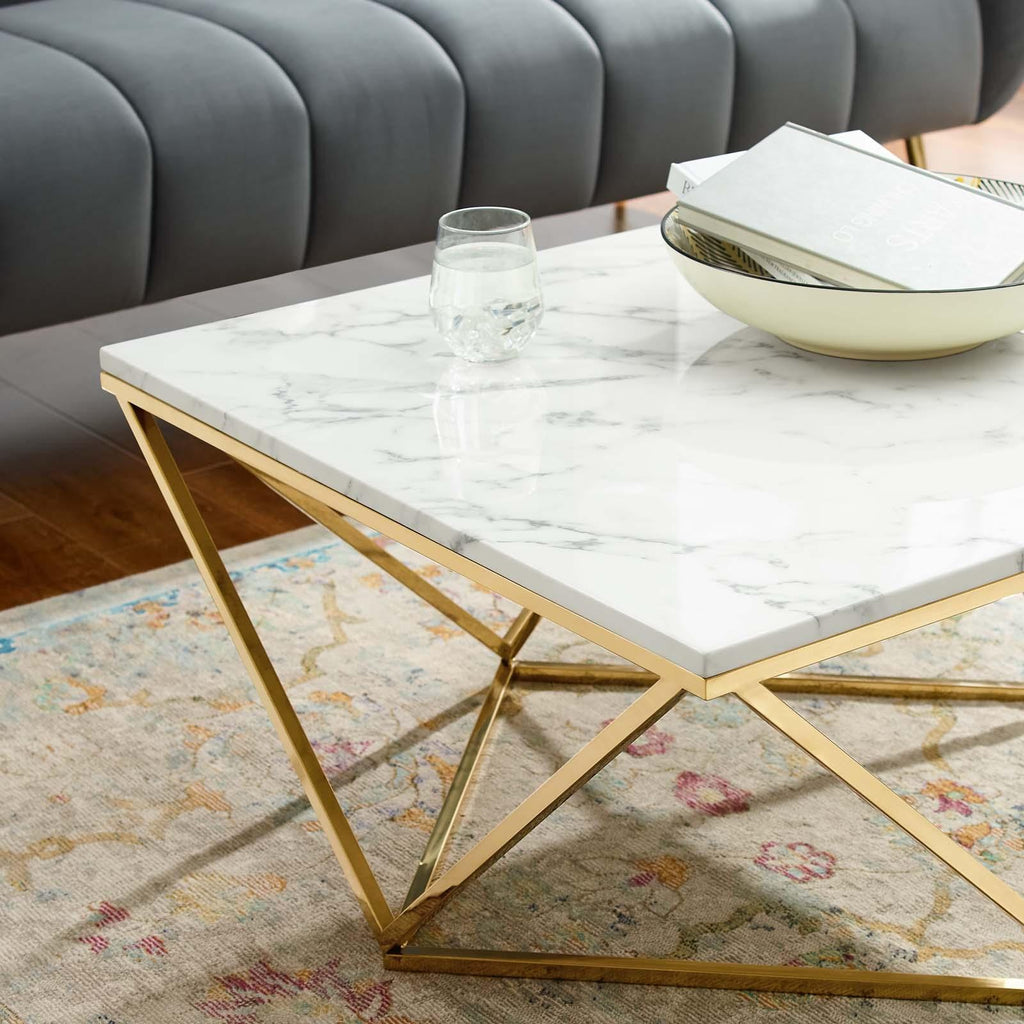 Redefine your home decor with the geometric design of the Vertex Coffee Table. A glamorous coffee table with modern appeal, this living room coffee table features intersecting lines to form triangular shapes that create the polished gold stainless steel base. A beautiful complement to the gold design, this coffee table boasts a square artificial marble tabletop to complete the look. Resting on non-marking foot caps, this artificial marble coffee table is perfect for the living room, lounge room, office, den, or bedroom sitting area. Assembly required.