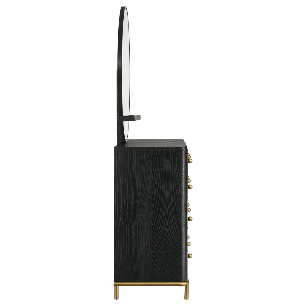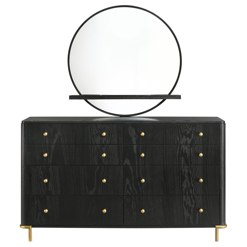 This mid-century modern dresser and mirror set blends elegant design with versatile functionality. The eight-drawer dresser features a wire-brushed sand wash finish, aged brass knobs, and slender metal legs for a refined touch. Felt-lined top drawers offer safe storage for delicate items, while softly rounded corners add subtle sophistication. Above, the round mirror includes a felt-lined tray and can be mounted to the dresser or hung independently on the wall, offering flexible styling and practical beauty for any bedroom._x005F_x000D_ Key Features: • Eight-drawer dresser in sand wash wire-brushed finish for natural texture • Aged brass knobs and slim metal legs offer modern mid-century charm • Felt-lined top drawers protect jewelry and delicate accessories • Round mirror includes felt-lined tray for storage and display • Mirror mounts to matching dresser or hangs freely on the wall • Crafted from rubberwood, engineered wood, and ash veneer