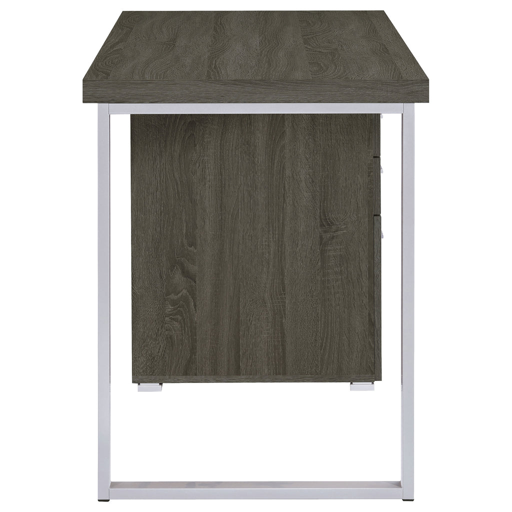 Streamline your workspace with this modern office desk that combines function and style. Supported by a sturdy silver metal frame, the design features a spacious work surface along with two storage drawers and a file cabinet that accommodates both legal and letter-sized documents. A reversible configuration allows you to set up the storage pedestal on either side, providing flexibility for any layout. Crafted with engineered wood and laminate veneer, this desk balances durability with sleek contemporary appeal._x005F_x000D_ Key Features: • Cappuccino office desk with modern design and silver finished metal framework • Reversible configuration allows storage pedestal on either left or right side • Includes two storage drawers and one file cabinet for organized workspace use • File cabinet accommodates both letter size and legal size document storage • Crafted with engineered wood and laminate veneer for everyday durability • Large work surface provides ample room for writing, studying, or computing
