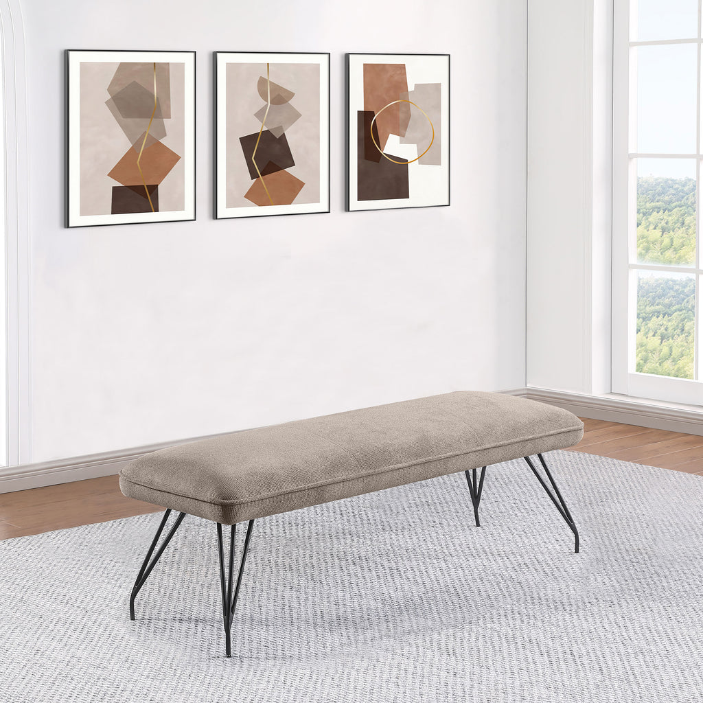Maximize space and offer casual comfort with this mid-century inspired L-shaped dining bench. Perfectly designed to fit against a wall or in a corner, this banquette style seating is ideal for compact spaces like eat-in kitchens and apartments. The bench features a gentle pitched backrest and a fixed seat supported by hairpin legs, providing a relaxed and stylish sitting solution. Constructed with metal, fabric (100% polyester), Asian Hardwood, foam, plywood, and webbing, the bench stands on hairpin style legs crafted in metal with a black finish, offering a crisp contrast to the neutral upholstery. The plush foam cushioning, covered in smooth fabric, along with a tufted back and pocket coil sinuous springs and webbing for cushion support, creates an inviting look and exceptional comfort.