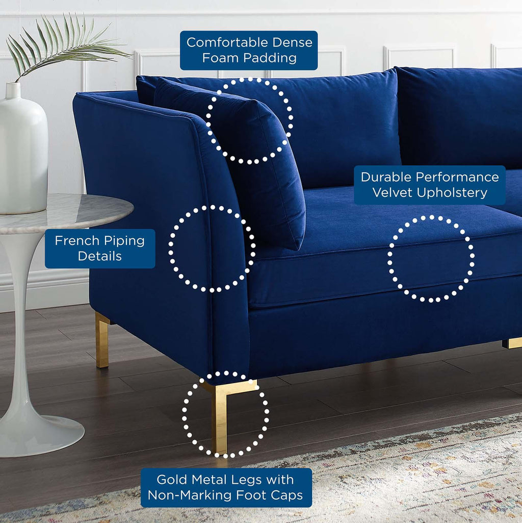 Introduce vintage modern and glam deco styles to your living space with the Ardent Performance Velvet Loveseat. With luxe velvety texture and classic French piping, Ardent refreshes homes, apartments, and office spaces. This sectional sofa collection that allows for a variety of configurations to suit any living room, bedroom, office space, or lounge area while hidden connection buckles offer a secure fit. Covered in stain-resistant performance velvet, this two-seater sofa features dense foam padding and a sinuous spring support system for a premium seating experience. The velvet loveseat sits on gold metal legs with non-marking foot caps to protect your flooring. Weight Capacity for Each Sectional Sofa Piece: 440 lbs.